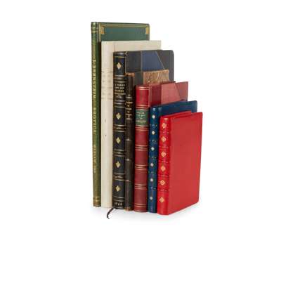 Memoirs of a Woman of Pleasure, being the Life and Adventures of Miss Frances Hill. London: Published for the proprietor, 1860. 12mo, 2 volumes bound together, 8 colour plates, later crushed red morocco gilt, small repair to final leaf; [de Musset, Alfred, attr.] "Baron Alcide de M***" Gamiani. London, 1907. 8vo, number 57 of 300 copies, frontispiece, 6 plates in 2 states, and 2 further plates in one state (vii, viii), contemporary half calf gilt; Scheffner, Johann Georg Gedichte im Geschmacke des Grecourt. London: Dodsley and Company, [1921]. 8vo, number 81 of 400 copies, 10 plates, original Japanese vellum gilt; Durel, Pétris La Femme dans les Colonies Françaises... Paris, 1898. 8vo, copy number 188, frontispiece, 21 plates, contemporary blue crushed half morocco gilt; Bernstein, Ignaz Jüdische Sprichwörter und Redensarten...(Erotica und Rustica), 1908. Large 8vo, green crushed morocco gilt by Birdsall; [Nougaret, Jean-Pierre Baptiste] - "Madame de Vilfranc" Les Foiblesses d'une Jolie Femme. London, 1786. 8vo, volume 1 only, later quarter morocco gilt; [Forbidden Fruit. N.p., n.d. but 19th century?] 12mo, printer's device, frontispiece, 40 engraved plates, blue morocco gilt (7)