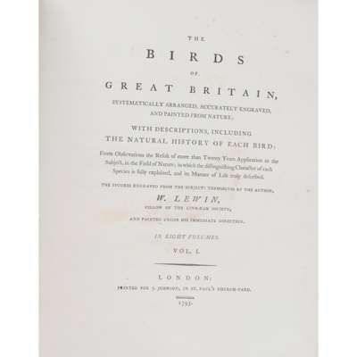 London: J. Johnson, 1795-1801. 8 volumes bound in 4, second edition, small folios, one of c.150 copies, 327 hand-coloured engraved plates (277 showing birds and 58 showing eggs), contemporary straight grained blue morocco gilt, neat bookplates attached to free-endpapers, a little very minor internal soiling, with occasional spotting and some light offsetting, some rubbing to joints and corners, slight fading to spines (4)