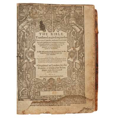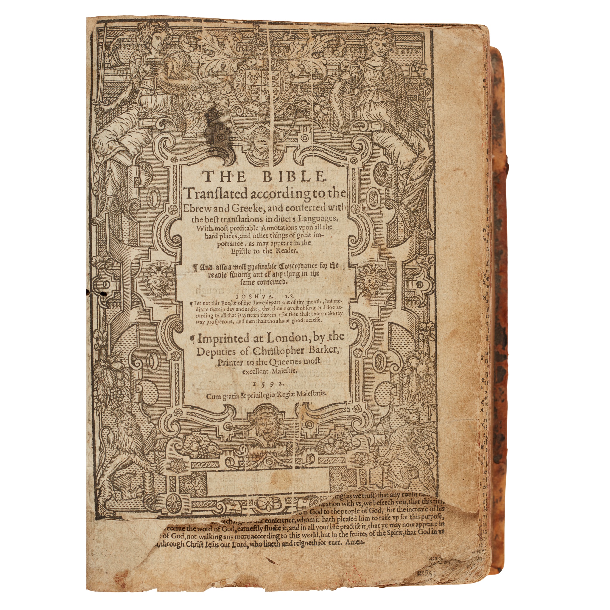 London: Christopher Barker, 1592. 8vo, several leaves with loss to text including the Old Testament title-page [ESTC S90493]; [bound with] Two Right Profitable and Fruitfull Concordances... London: Christopher Barker, [n.d.] 8vo; contemporary panelled calf, covers detached, some soiling, several headers trimmed slightly affecting text