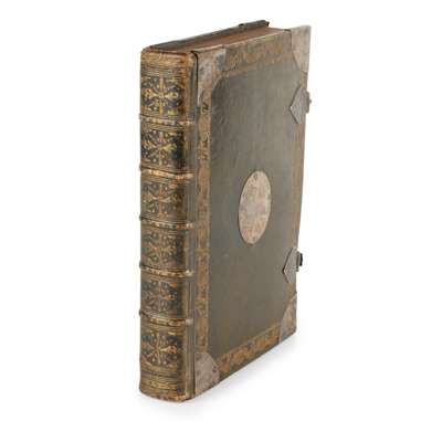 Cambridge: John Field, 1668 [NT dated 1666]. Small 4to, lacking leaf 2Pi1 (i.e the dedication leaf), lower right corner of Oo4 torn with very slight loss to text, lacking the Apocrypha [ESTC R18074]; [bound with] Index Biblicus: or an exact Concordance to the Holy Bible... Cambridge: John Field, 1668 [ESTC R25715]; [bound with] The Psalms of David in Meeter. Edinburgh: Andrew Anderson, 1669 [ESTC R33009], some trimming to headers; in contemporary black morocco with gilt tooling to spine, covers with gilt tooled borders depicting angel and floral motifs, white metal corners and clasps (one clasp broken), engraved white metal discs to covers, bookplate, ownership inscriptions of Jane Muir Mackenzie (1787) and John A. Fairley, 1918, stating that the Bible was a gift from Lady Frances R. Muir