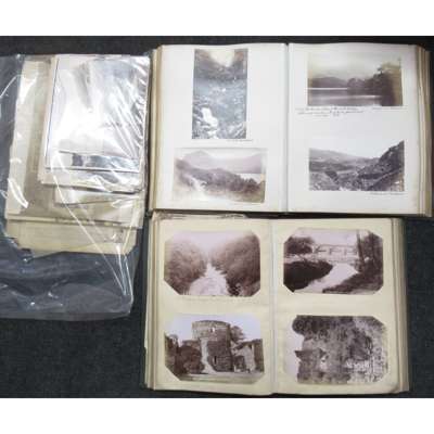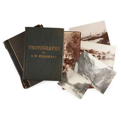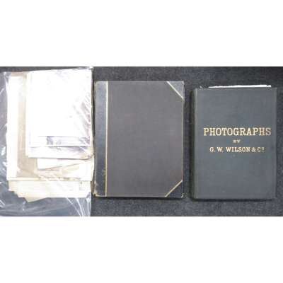 photographs of Belgium, The Hague, Scheveningen, Dutch paintings, Leyden, Haarlem, Amsterdam, Utrecht, Cologne, The Lake District, and Scotland, some by James Valentine and George Washington Wilson with caption in negative, French cities, half morocco, worn; Album 2 'Photographs by G.W. Wilson & Co.', c. 152 albumen prints loosely inserted onto leaves, green cloth lettered in gilt, [c. 1880]; and c. 100 loose albumen prints, chiefly of Europe (3)