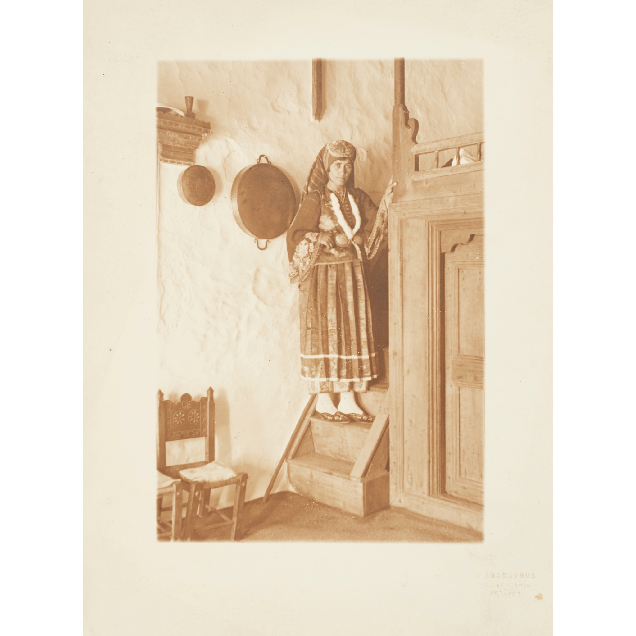 1930s, each 27 x 37cm, with Zographos blindstamps to margins, showing a woman in a house, a coastal scene, a seated man, a view of a village, a man and woman seated, a woman by a fireplace, an elderly man standing, a man and woman seated, a priest, a view looking down onto a village, a group of young people in traditional costume, an elderly woman seated (12)