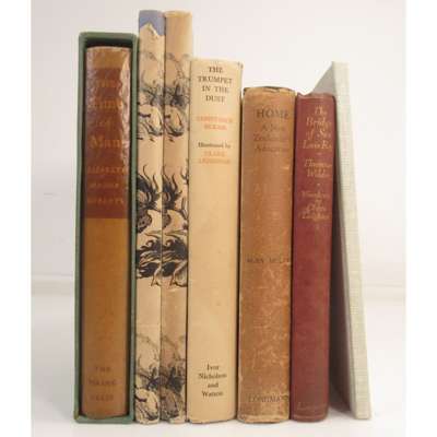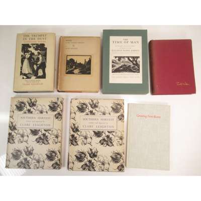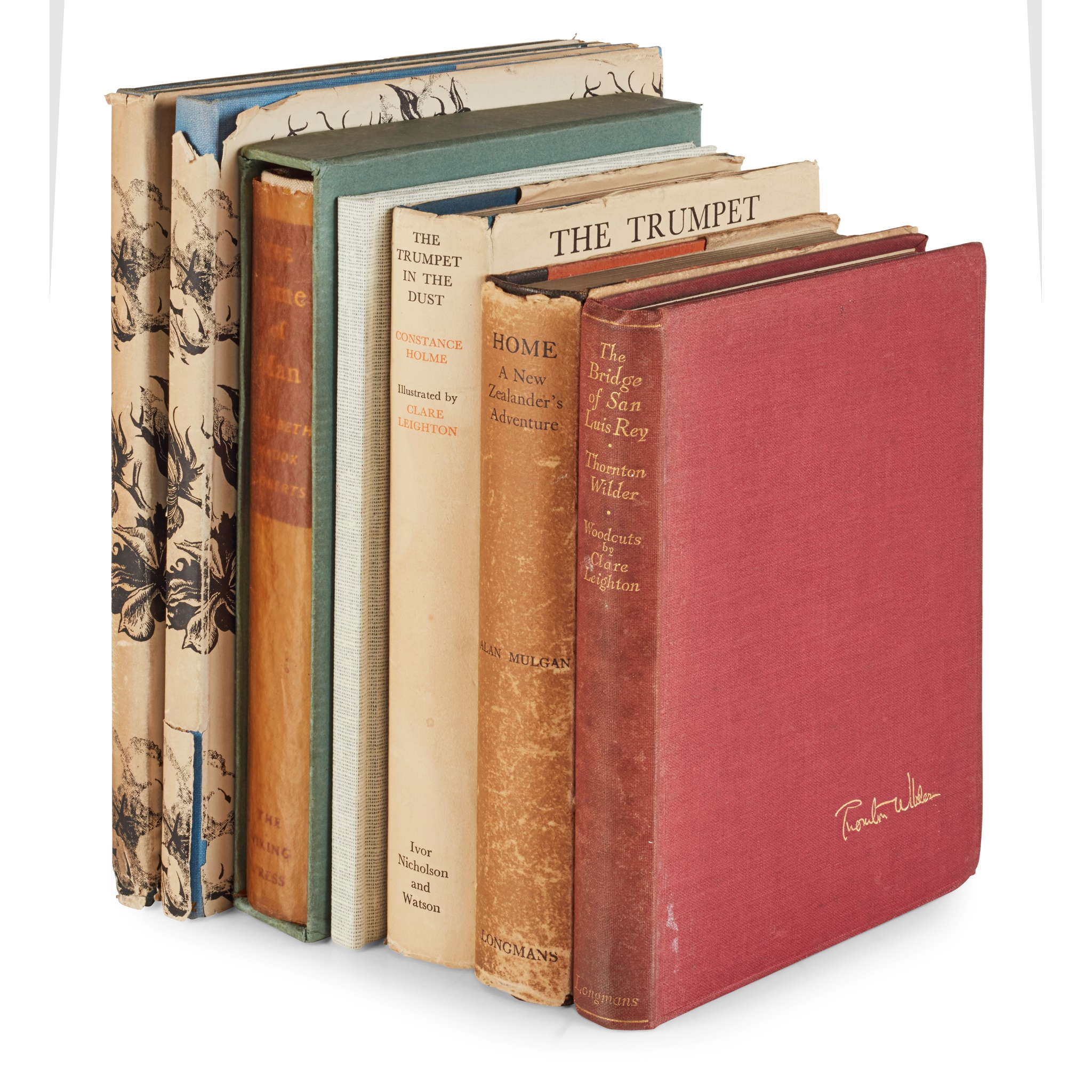 Four Hedges. 1935. 4to, original cloth, dustwrapper slightly spotted; Southern Harvest. 1943, 2 copies, both with dust-jackets slightly frayed; Holme, Constance The Trumpet in the Dust. 1934, woodcuts by Leighton, dustwrapper lightly soiled; Growing New Roots, An Essay with Fourteen Wood Engravings. Book Club of California, 1976. 8vo, number 287 of 500 copies signed by Leighton, original cloth; Wilder, T.N. The Bridge of the San Luis Rey. 1929, woodcuts by Leighton, original maroon cloth, spine slightly faded; Mulgan, Alan Home, a New Zealander's Adventure. 1927. 8vo, woodcuts by Leighton, original black cloth-backed orange boards, dustwrapper with woodcut on upper wrapper, dustwrapper slightly discoloured, slightly rubbed; Roberts, E.M. The Time of Man. New York: Viking Press, 1945. 8vo, wood-engravings by Leighton, original cloth, glassine wrapper, slipcase (8)