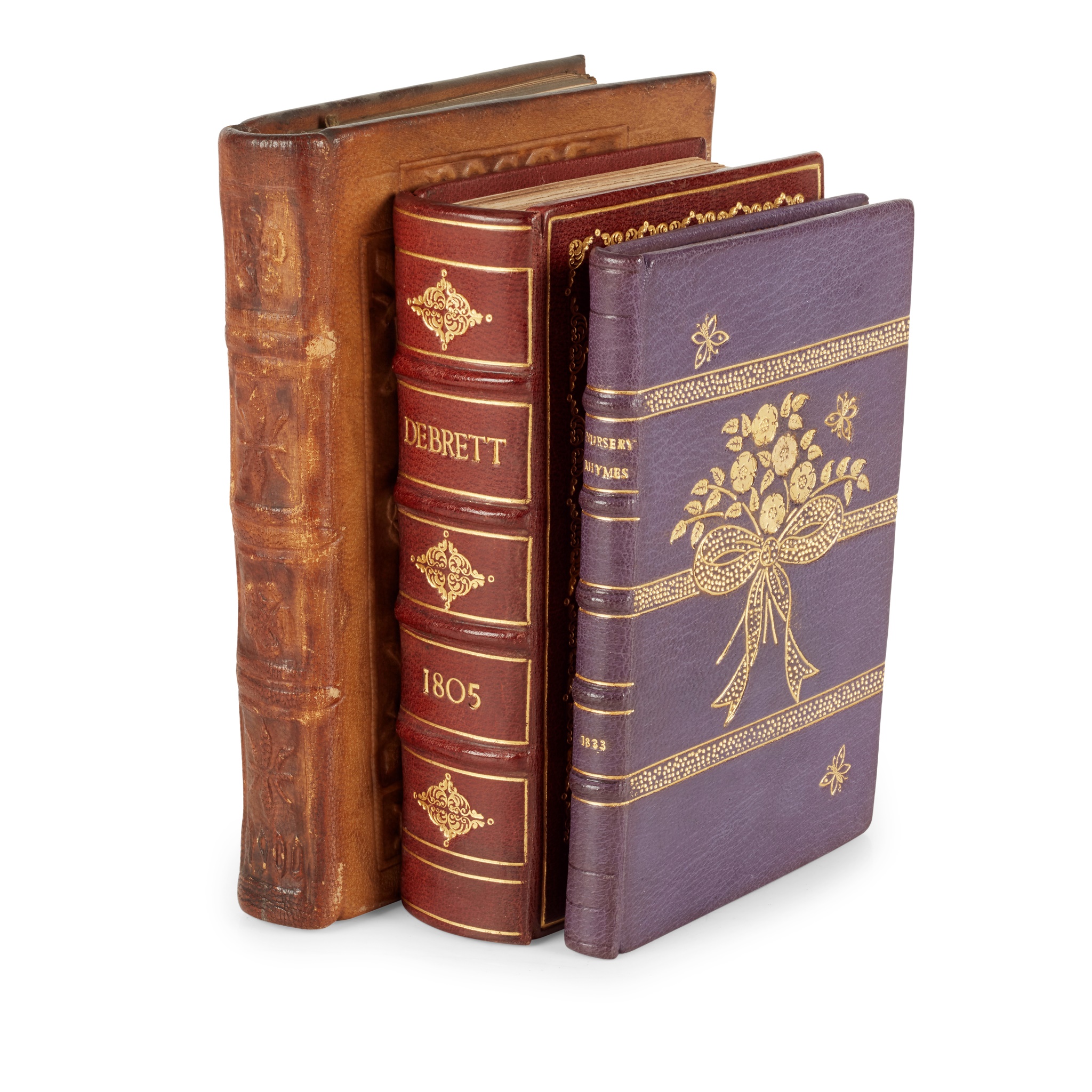 Debrett’s Correct Peerage of England, Scotland and Ireland… London: F. & C. Rivington, 1805. 12mo, volume 1 only, leaves of arms, in full chestnut brown morocco with a gilt tooled diamond pattern to covers by Daphne Beaumont Wright; Rhymes for The Nursery. London: Darton and Harvey, 1833. Twenty-fifth edition, 12mo, in full purple morocco with ribbon and floral gilt tooling to upper cover by Daphne Beaumont Wright; Rossetti, Dante Gabriel Poems. Leipzig: Bernhard Tauchnitz, 1873. Small 8vo, in contemporary embossed pigskin with rose and thorn motifs (3)