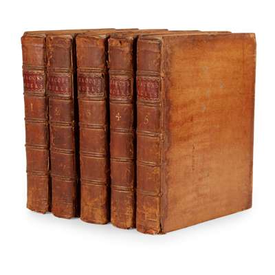 London: J. Rivington [&c.], 1778. 5 volumes, 4to, titles printed in red and black and with engraved vignette, 4 engraved frontispieces, 2 folding tables, contemporary calf, red morocco lettering pieces, worn