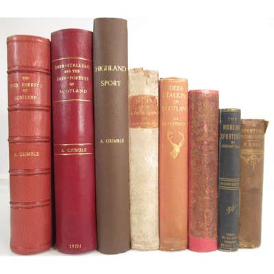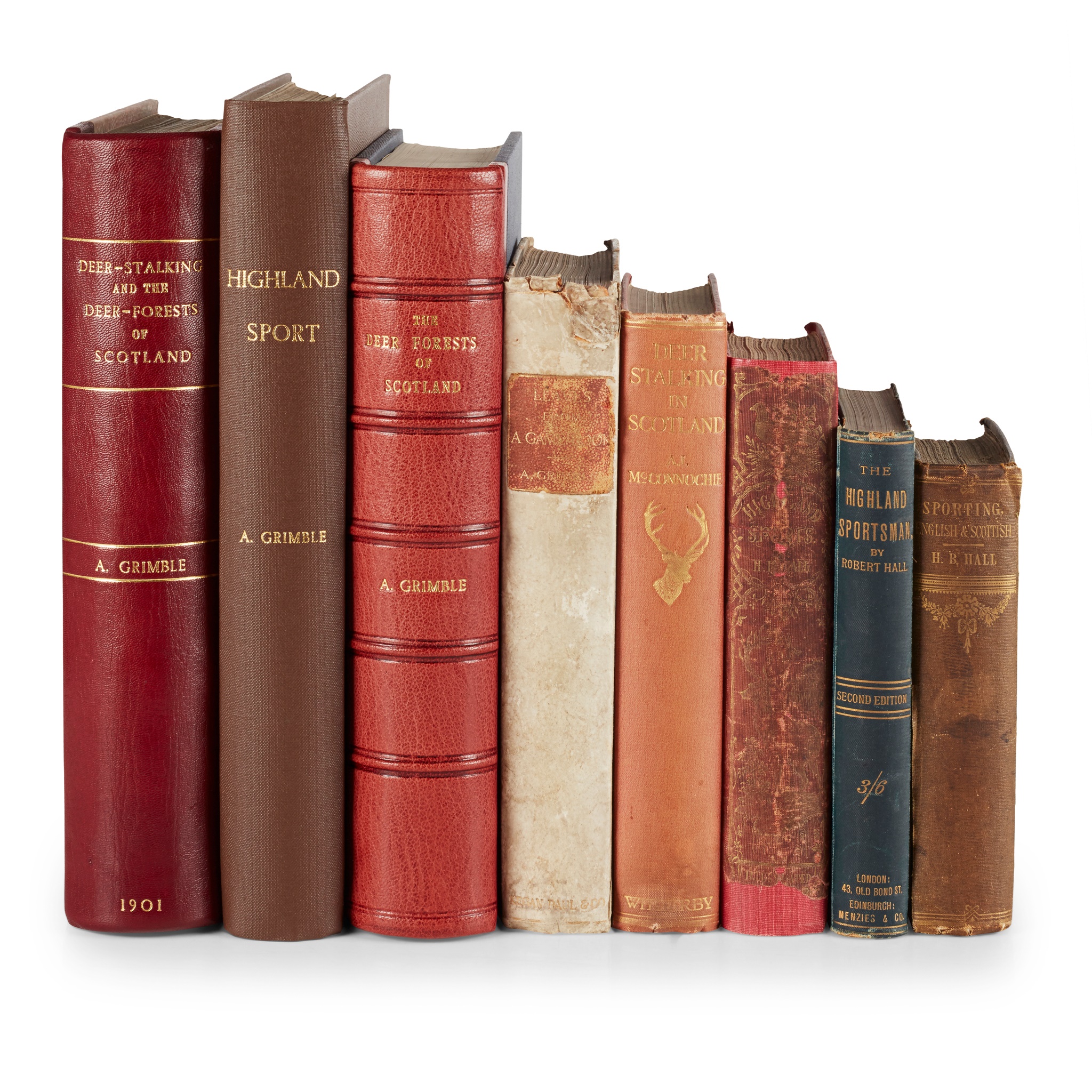 The Deer Forests of Scotland. 1896. First edition, 4to, limited to 500 copies, 8 plates, modern tan morocco-backed cloth; Grimble, Augustus Deer-Stalking and the Deer Forests of Scotland. 1901. 4to, plates, modern maroon morocco-backed marbled boards, spine gilt, occasional light finger soiling to text; Grimble, Augustus Highland Sport. 1894. 4to, 10 plates by Archibald Thorburn, modern cloth; Grimble, A. Leaves from a Game Book. 1898. 8vo, limited to 250 copies, original half parchment, worn; McConnochie, A.I. Deerstalking in Scotland. 1924, original cloth; Hall, Herbert Byng Highland Sports and Highland Quarters. 1848. 2 volumes in 1, 8vo, 12 plates, original pictorial red cloth gilt, vol. 2 bound without title, rebacked retaining original spine; Hall, Robert The Highland Sportsman. [c.1880], 8vo, plates, original cloth; Darling, J., publisher The Sportsman and his Dog. 1850, 12mo, original cloth, worn (8)