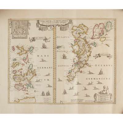 London: [n.d.], a later state c.1700, 44.5 x 56.5cm, hand-coloured, laid-down, a little generalised soiling; Hondius, Henricus Orcadum et Schetlandiae Insularum accuratissima descriptio. [Amsterdam, 1636], 52 x 62cm, hand-coloured in outline, some creasing and a few small nicks (2)