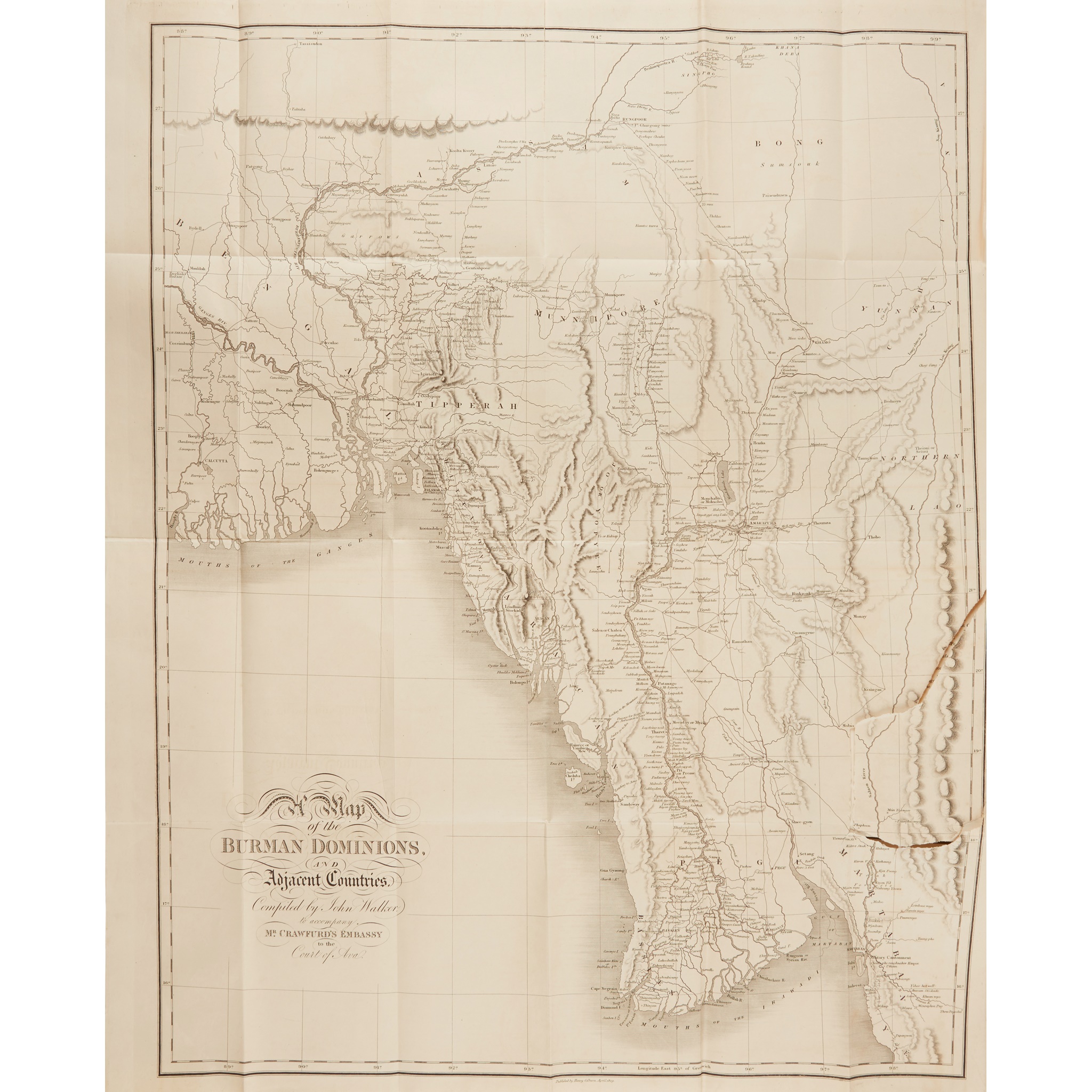 to the Court of Ava. London: H. Colburn, 1834. Second edition, 2 volumes, 8vo, large folding map torn in two without loss, folding plan and 6 plates, vignettes, half-title in volume 1, original grey embossed cloth, slightly marked