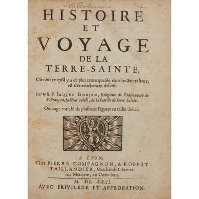 Lyon: P. Compagnon & P. Taillandier, 1671. Second edition, 4to, woodcut device on title-page, woodcut initials, head- and tail-pieces, additional privilege leaf in preliminaries, folding engraved map of the Holy Land (slightly torn at fold), 16 folding engraved plates, contemporary calf, occasional light foxing, spotting or staining, binding lacking backstrip