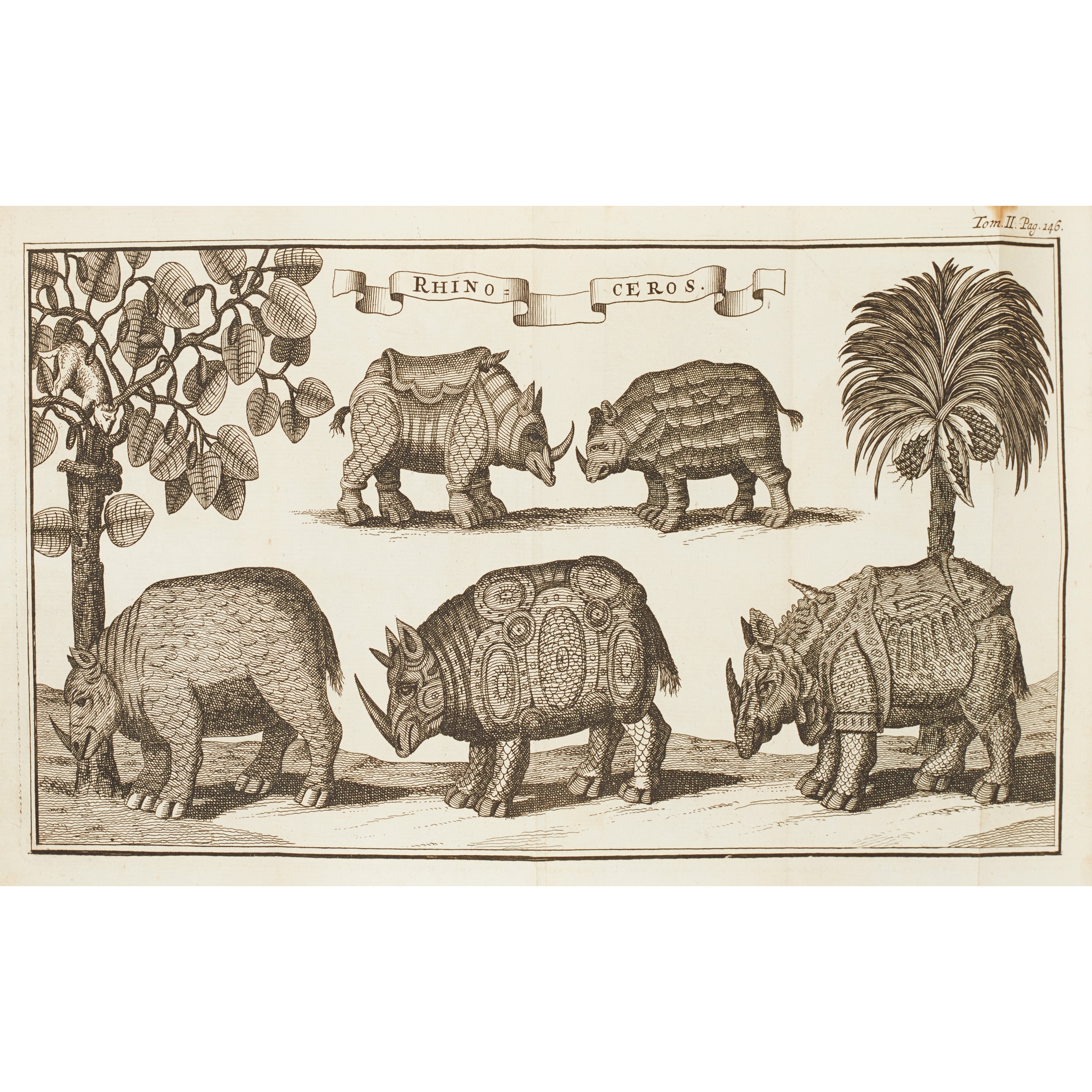 London: David Mortier, 1708. First edition, 2 volumes, 12mo, 2 frontispieces, 31 folding maps and plates, later quarter vellum, a little worming towards the rear of volume 1 and to the covers of volume 2 not seriously affecting text but affecting one plate, a few small spots and marks to plates and leaves, volume 2 pp.95-6 torn to lower inner corner with significant loss to text (2)