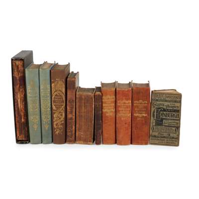 Burns, Robert Poems Chiefly in the Scottish Dialect London: A. Strachan..., 1787. Third [first London] edition, 8vo, half-title, portrait frontispiece, contemporary calf, binding rubbed and split along spine, text-block also split, some light dampstaining to upper margins, a few other internal marks [T91546]; Horne, James Fifteen One Day Cycle Tours from Edinburgh. Edinburgh: W. & A.K. Johnston, [n.d.] Tall 12mo, folding map, original cloth covers; The Edinburgh Almanac...for 1835 Edinburgh: Oliver & Boyd. 12mo, contemporary calf, some leaves missing; The Edinburgh Almanac...for 1841 Edinburgh: Oliver & Boyd. 12mo, contemporary red calf gilt; New Edinburgh Almanac...for 1847 Edinburgh: Oliver & Boyd. 12mo, contemporary red calf gilt; New Edinburgh Almanac...for 1860 Edinburgh: Oliver & Boyd. 12mo, contemporary red calf gilt; Sinclair, Catherine Shetland and the Shetlanders, Northern Circuit. Edinburgh: William Whyte and Co., 1840. 8vo, original blue cloth gilt; [Idem] Scotland and the Scotch, the Western Circuit. Edinburgh: William Whyte and Co., 1840. 8vo, original blue cloth gilt; and 3 others (11)