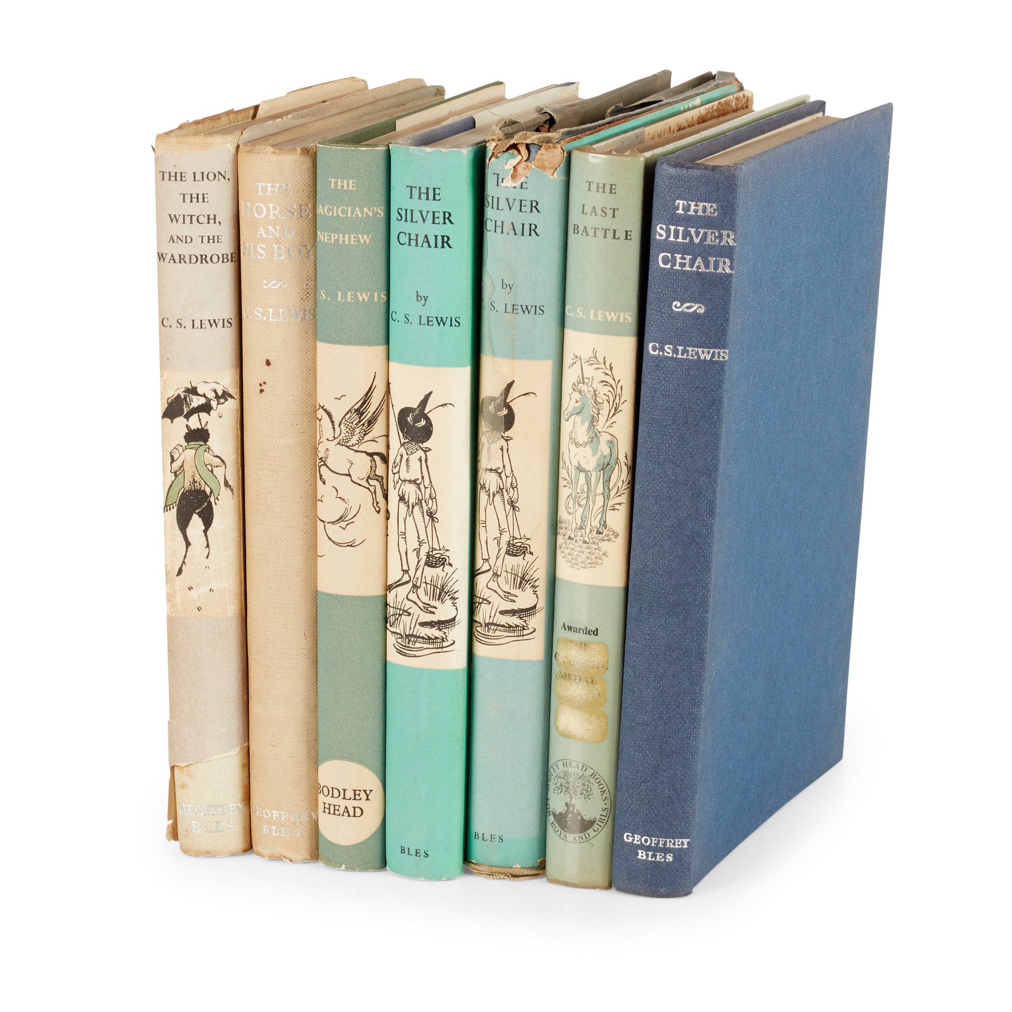 London: Geoffrey Bles, [1950]. First edition, 8vo, "First Published 1950" printed on the copyright page, original green cloth, dust-jacket not price-clipped but with a few chips and tears including some loss to spine and lower wrapper, slightly soiled and rubbed, ownership stamp to front free-endpaper, spine faded, shelf lean; The Horse and His Boy. London: Geoffrey Bles, [1954]. First edition, 8vo, original cloth; and later editions of The Silver Chair (3 copies), The Magician's Nephew and The Last Battle (7)