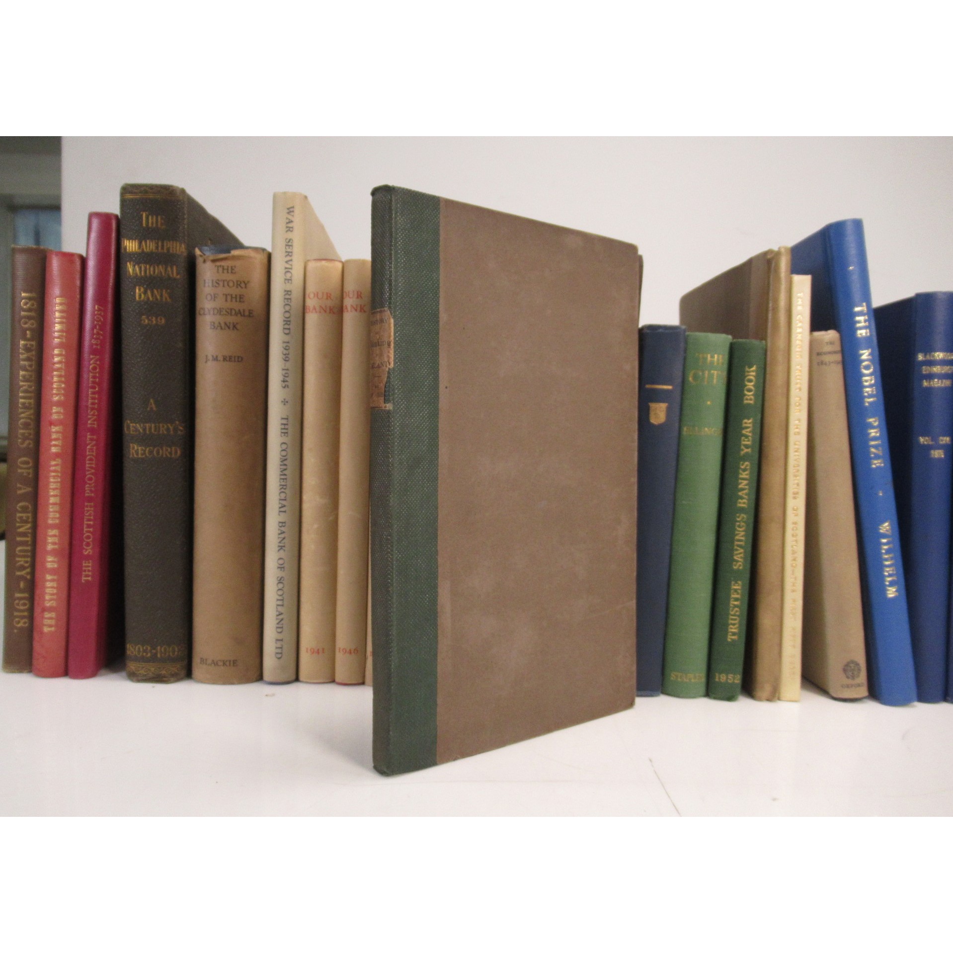 The History of Banking in Ireland. London: Longman &c., 1836. First edition, original green cloth-backed boards "A Stockholder". The Philadelphia National Bank. A Century's Record 1803-1903. Philadelphia, 1903, original cloth gilt; National City Bank of New York National Bank Organization 1812-1904. New York, 1904, original blue cloth; Harper, William Hudson, & C.H. Ravell Fifty Years of Banking in Chicago. The Merchants' Loan and Trust Co., 1908, original cloth gilt; Anderson, James L. The Story of the Commercial Bank of Scotland Limited. Edinburgh, 1910, quarter morocco gilt; Experiences of a Century 1818-1918. Brown Brothers and Company, Philadelphia. London & Baltimore, 1918, Privately Printed, original buckram gilt; Ralfe, P.G. Sixty Years of Banking 1865-1925. A Short History of the Isle of Man Banking Company Ltd. 1926, Compliments slip inserted, original quarter buckram; McCulloch, J.H. and Stirling., K.J. The Edinburgh Savings Bank 1836-1936. 1936, original black buckram gilt; Steuart, M.D. The Scottish Provident Institution 1837-1937. Edinburgh, 1937, original red buckram gilt; Reid, J.M. The History of The Clydesdale Bank 1838-1938. 1938, original blue buckram gilt, Compliments slip inserted, dustwrapper; Ellinger, B. The City. 1940, original cloth; Our Bank The Story of The Commercial Bank of Scotland Ltd. 1810-1941. 1942, original red cloth gilt, dustwrapper; Our Bank The Story of The Commercial Bank of Scotland Ltd. 1810-1946, 3 copies, original red cloth, dustwrapper; The Commercial Bank of Scotland Limited War Service Record 1939-1945. 1952, 2 copies, original blue buckram gilt, dustwrapper; Peddie, J.R. The Carnegie Trust for the Universities of Scotland 1901-1951. 1951, original quarter cloth; Trustee Savings Banks Year Book. 1952, original cloth; Streeter, Edward Window on America... 175th Anniversary of The Bank of New York. New York, 1959, original pictorial boards; McLaren, M. The Capital of Scotland. 1950, de Luxe edition, limited to 500 signed copies, original calf gilt; and 5 others (Blackwood's Edinburgh Magazine, vol. 118; Scotland's Record, 1946; The Economist 1843-1943, 1943; Wilhelm. The Nobel Prize, 1983; The Scottish Bankers Magazine, vol. 52 no. 208)