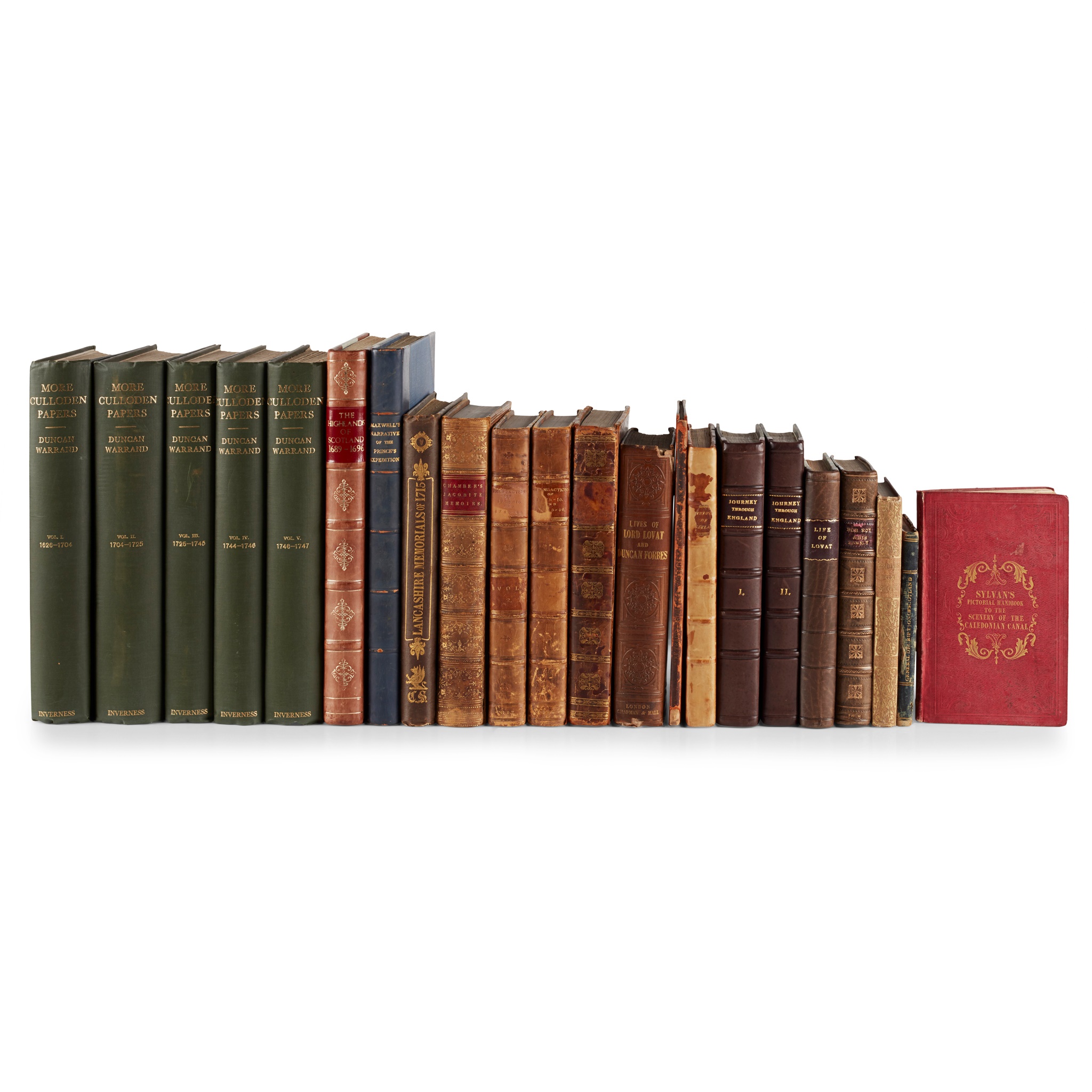 Warrand, Duncan More Culloden Papers. Inverness, 1923-30. 5 volumes, 4to, plates, maps, original green cloth gilt; [Duncan, William] The History of the Lives and Reigns of the Kings of Scotland. Dublin: J. Harding, 1722. 4to, contemporary calf, rebacked; Arbuthnot, Archibald The Life, Adventures... of Simon Lord Lovat. London: R. Walker, 1746. 8vo, folding frontispiece repaired, modern quarter calf, some spotting and staining; Forbes, Robert. Jacobite Memoirs of the Rebellion of 1745. Edinburgh, 1834. 8vo, contemporary calf; Ware, Samuel The State of Parties in Lancashire before the Rebellion of 1715. Chetham Society, 1845, 4to, presentation copy from the author, original cloth; Charles, George History of the Transactions in Scotland, in the years 1715-16 and 1745-46. Stirling, 1816, 2 volumes, 8vo, contemporary half calf, slightly rubbed; [Macky, John] A Journey through England. 1724, 2 volumes, 8vo, modern quarter calf lettered in gilt; Maitland Club Papers illustrative of the political condition of the Highlands of Scotland. Glasgow, 1845. 4to, modern half calf; Maxwell, James Narrative of Charles Prince of Wales' Expedition to Scotland in the year 1745. Edinburgh, 1841. 4to, modern blue half calf; and others relating to Scotland; Helme, Elizabeth St Clair of the Isles, or the Outlaws of Barra. 1825, additional engraved title, plates, contemporary calf, some spotting, slightly rubbed;and others (quantity)