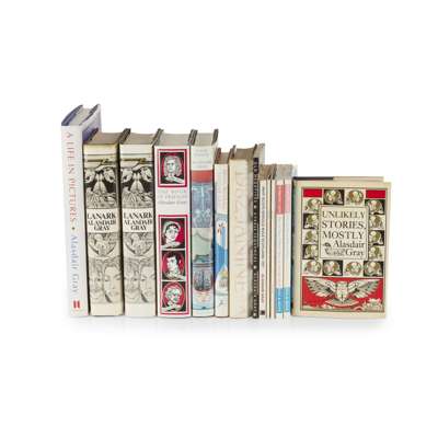 Lanark. Edinburgh: Canongate Publishing, 1981. First edition, signed "Alasdair Gray 27th February 1981", original cloth, dustwrapper; another copy. First edition, inscribed "To Katie [Gardiner] (who knew it was coming) from Alasdair 25th Feb 1981", original cloth, dustwrapper, faint dampstain at foot of wrapper, and slight discolouration at head of spine; The Book of Prefaces. London and New York: Bloomsbury Publishing, 2000. First edition, presentation copy "To Katy [Gardiner] from Alasdair here in Hamilton Park Avenue Sunday 28 May 2000", with a fine full-page portrait of Katy Gardiner, on verso of blue front free endpaper, dustwrapper; Poor Things. London: Bloomsbury Publishing, 1992. First edition, presentation copy, "from he of old Riddrie too, Alasdair Gray for Katie [Gardiner] on Tuesday 8 December 1992, here in 17 Lothian Street, I mean Road, no I mean house" with stylised portrait of sky, sun, moon and stars, dustwrapper spine a little faded; 1982. Janine. London: J. Cape, 1984. First edition, presentation copy "To SUSAN [Boyd] from Alasdair, June 1984, hoping she will find it forgivable after all: if only for the anarchist binding", dustwrapper slightly soiled and slightly faded; Sixteen Occasional Poems 1990-2000. Glasgow: Morag McAlpine, 2000, 2 copies, first editions, both inscribed, the first "To Susie [Boyd] with love -a wee toaty book, at last from Alasdair", the second "To Katy [Gardiner] from Alasdair, because 1 good wee book of verse deserves back another wee verse book, at least, 12th May 2000", both original wrappers; Working Legs. Glasgow: Dog and Bone, 1997, 2 copies, First editions, both inscribed, the first "To Susie [Boyd] from Alasdair that she need not buy one 12.12.1997", the second "To Katy [Gardiner] that she need not buy one 10.12.1997", both original wrappers, the second very slightly faded; Why Scots should Rule Scotland. Canongate. 1997, First edition, inscribed "To Katy [Gardiner] from Alasdair 10th April with love", original wrappers; Unlikely Stories, Mostly. Edinburgh: Canongate Publishing, 1983, First edition, presentation copy "To Sue [Boyd] from * Christmas 1983" [the asterisk is placed next to his printed signature], dustwrapper slightly discoloured; Old Negatives. London: J. Cape, 1989. First edition, presentation copy "To Susie [Boyd] with love from Alasdair", original wrappers; Mavis Belfrayge. London: Bloomsbury, 1996. First edition, presentation copy "TO KATIE [Gardiner] from Alasdair 16 May 1996", original cloth, duswrapper; A Life in Pictures. Edinburgh: Canongate, 2010. First edition, presentation copy to "Kate Gardiner, her book, says Alasdair with love 25.10, or rather 26th October 2010", original cloth, dustwrapper (14)