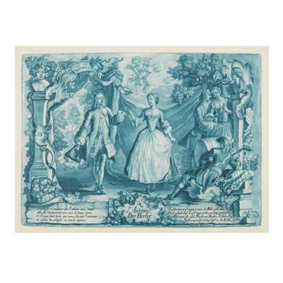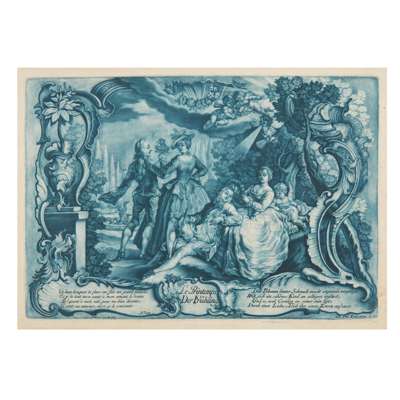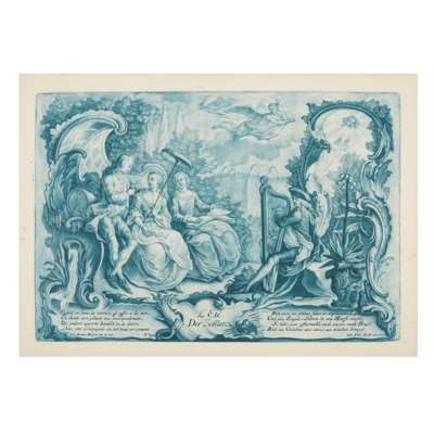 [Four Seasons:] Le Printemps/Der Frühling; L'Eté/Der Somer; L'Automne/Der Herbst; L'Hiver/Der Winter; etchings in blue, 28 x 39cm, stuck down on card, etched titles and text in French and German, [18th century]