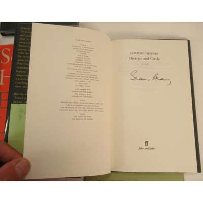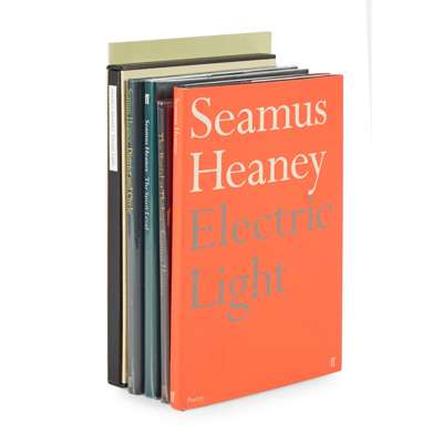 Electric Light. Faber & Faber, 2001. number 188 of 300 copies signed by the author, original black cloth-backed cream boards, slipcase; Electric Light. 2001, first trade edition, original black boards, orange dustwrapper; District and Circle. Faber, 2006, First edition, signed by the author on title, dustwrapper; The Spirit Level. Faber, 1996, first edition, dustwrapper; The Burial at Thebes. Sophocles' Antigone, translated by Heaney. Faber, 2004, First edition, original boards, dustwrapper; The Fire i' the Flint. O.U.P., 1974, original green wrappers; Spelling out Out. in honour of Brian Friel on his 80th Birthday. The Gallery Press, 2009, original brown wrappers; Dylan the Durable ? On Dylan Thomas. 1992, original pictorial wrappers; Diary of one who vanished, a song cycle by Leos Janacek in a new version by Seamus Heaney. Faber & Faber, 1999, original yellow wrappers; From the Republic of Conscience. Amnesty International, 1985, limited to 2000 copies, original wrappers; with Michael Longley. An Upstairs Outlook. Belfast, 1989, original wrappers; Sweeney Astray. Derry, 1983, First edition, original cloth, dustwrapper (12)