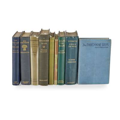 The Thirty-Nine Steps. Edinburgh: William Blackwood and Sons, 1915. First edition in book form, 8vo, publisher's original blue cloth, ownership signature to front free-endpaper, some browning; Parker, Gilbert The Lane that had no Turning. London: William Heinemann, 1900. First UK edition, 8vo, original pictorial red cloth, dust-jacket present and not price-clipped, some rubbing to cloth spine; Phillpots, Eden The Portreeve. New York: Macmillan, 1906. 8vo, detailed signed author's inscription, original blue cloth gilt; Hardy, Thomas A Changed Man... London: Macmillan and Co., 1913. 8vo, original green cloth gilt; Taylor, Rachel Annand Poems. London: John Lane, the Bodley Head, 1904. 8vo, original green cloth gilt; Moore, T. Sturge Absalom, a play in three acts. London: at the Sign of the Unicorn, 1903. 8vo, original green cloth gilt, tears to glassine jacket; Davidson, John Self's the Man. London: Grant Richards, 1901. 8vo, original green cloth gilt; Haggard, H. Rider Lysbeth, a tale of the Dutch. London: Longmans, Green, and Co., 1901. 8vo, original blue-green cloth gilt; Arnold, Sir Edwin The Voyage of Ithobal. New York: G.W. Dillingham Company, 1901. 8vo, original blue cloth gilt, inscribed from the author (9)