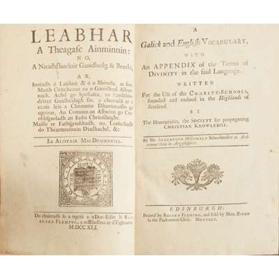 Note: An excellent copy of one of the first Gaelic-English vocabularies published, Hugh Cheape writes that MacDonald, "...dominates the stage of Gaelic literature; a learned, inventive and complex author..." MacDonald's Ais-eiridh na Sean Chànoin Albannaich, no An nuadh Oranaiche Gaidhealach [The Resurrection of the Ancient Scottish Language, or New Gaelic Songster] of 1751, "...might well have encouraged another Jacobite rising with its powerful propagandist tone." [see Cheape, Hugh. The Gaelic Book - The Printed Book in Scottish Gaelic]
