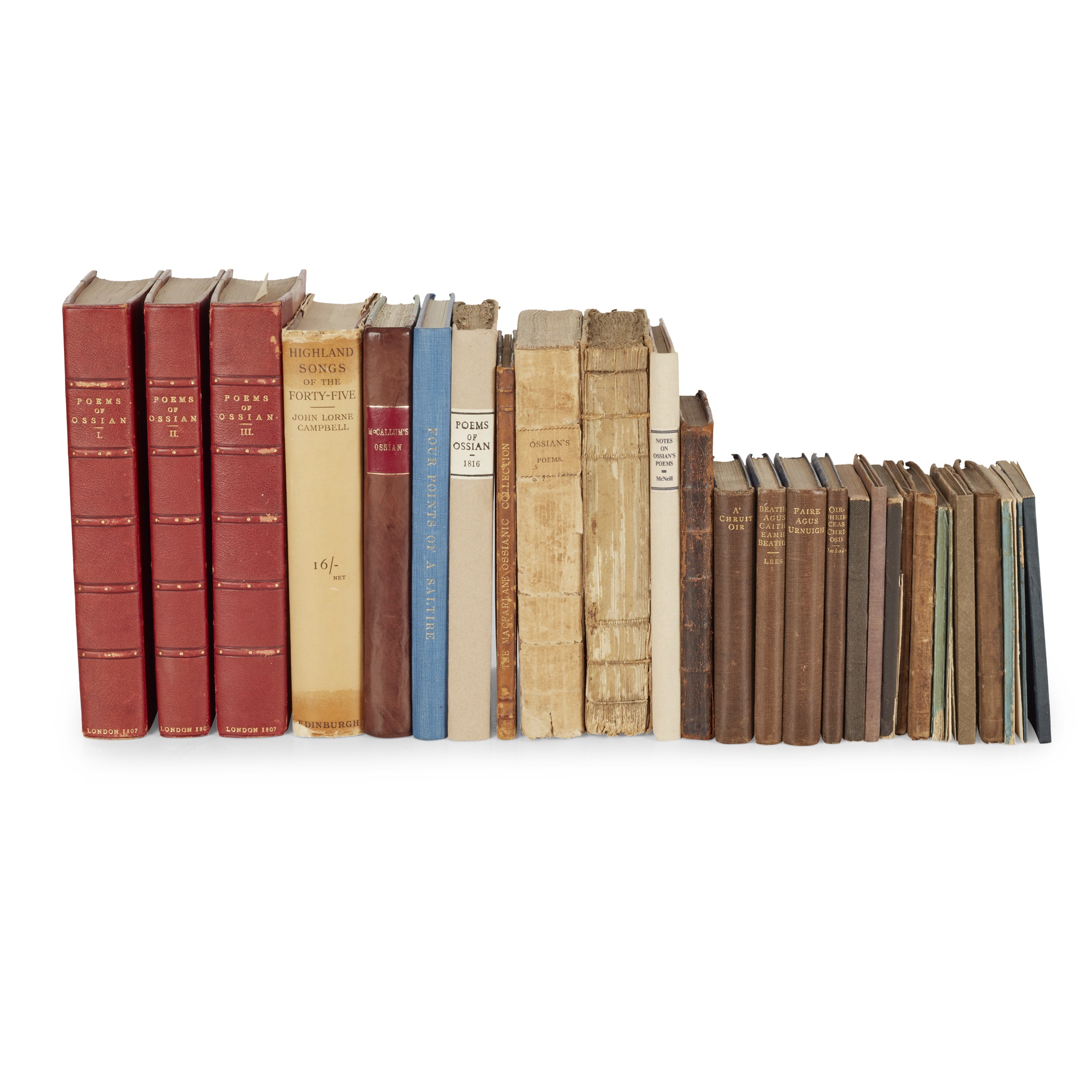 The Poems of Ossian, in the original Gaelic. London: G. and W. Nicol, 1807. 3 volumes, 19th century red half morocco gilt; [Idem] The Poems of Ossian, the Son of Fingal. Inverness: John Young, 1804. 8vo, original boards; [Idem] - McCallum, Hugh and John, editors An Original Collection of the Poems of Ossian... Montrose: the Review Newspaper Office by James Watt, 1816. 8vo, modern quarter calf gilt; [Idem] another copy, original boards with renewed spine; [Idem] The MacFarlane Ossianic Collection. 8vo, 20th century half calf gilt; McNeill, Archibald Notes on the Authenticity of Ossian's Poems, 1868. 8vo, inscribed by the author to half-title, modern quarter cloth; Mac Diarmid, Eobhann Searmona. Edinburgh: T. Stuart, 1804. 8vo, original boards, upper cover detached; MacPharlain, P. Comhnadh arson Aoradh Teaglaich agus Urnuighean Diomhair... Edinburgh: William Blackwood, 1829. 8vo, contemporary calf; MacLean, Sorley, and others Four Points of a Saltire. Edinburgh, 1970. 8vo, signed by Sorley MacLean, George Campbell Hay, William Neill and Stuart MacGregor on their portraits, original blue cloth gilt; Campbell, John Lorne Highland Songs of the Forty-Five. Edinburgh: John Grant. 8vo, signed and inscribed with the editor's compliments, dust-jacket; [AND] a collection of Gaelic school books, including: An Ceud Leabhar air son Nan Sgoilean Gaelach. Edinburgh: Blackwood, c.1890. 12mo, wrappers; An Leabhar air son Ceud Bhuidhne anns na Sgoilibh Gae'lach Gluasadach. Edinburgh, 1825. 12mo, contemporary cloth; and 14 other small books (28)