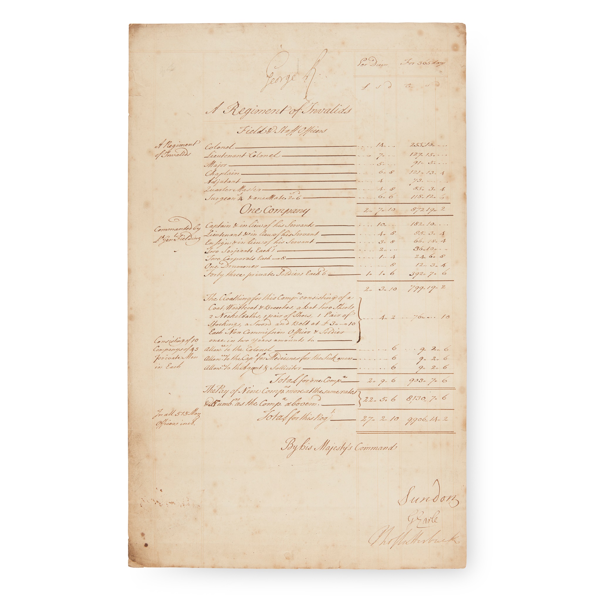 folio leaf 46 x 28cm, detailing total pay for field and staff officers and sundry allowances such as "Allowance to the Col. & for clothing lost by deserters &c.", with accounts for "A Regiment of Invalids" to the reverse, each side signed "George R" to the head