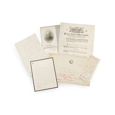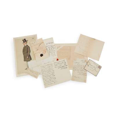 including: Carlyle, Thomas dated signature on a slip of paper relating to borrowing a copy of Don Quixote; Woodall, William ALS, dated 1893; Clifford, Lucy ALS to Mr Ervine, dated 1920; Chalmers, Thomas Autograph note, signed, dated 1830; Gibson, John ALS to Mr Caldwell, dated Rome, 1838; and another, similar; Campbell, Thomas ALS to W. Pickersgill [Henry William Pickersgill, a portrait painter], dated 1830; Macaulay, Thomas Babington signed visitor's pass given to John Heiton, dated 1844; and a collection of others; Campbell-Bannerman, H. ALS refuting the claim that he "went to the Ayr Burghs at the suggestion of Mr. J.G. Weir, or that he (or any one else) contributed to my Expenses...", laid onto mount with portrait above; Pelham, Henry Signature on clipped document; Temple, Henry John, 3rd Viscount Palmerston Letter signed, dated 29th January 1814, to Colonel James Lowther, referring to the Westmoreland Regiment of Militia joining the Provisional Batallion of Militia in Europe under Colonel Sir William Watkins Wynne; Cavendish-Bentnick, William, 3rd Duke of Portland Document signed bearing his wax seal; and one other; with a Vanity Fair caricature "Property and Principle"; Chamberlain, Neville Typewritten letter, signed as Minister of Health, dated 19th January 1926