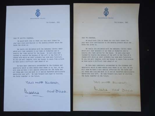 possibly autopenned, each dated 7th October 1981, the first addressed to Mr and Mrs Stephens and the second (browned) addressed to Mrs Wakeham, typed letters thanking the recipients for the gift of a mahogany library table and a cheque, both inscribed "Yours most sincerely" in Diana's hand, and signed "Charles" "and Diana", on Buckingham Palace headed paper; and a plastic tote bag commemorating the marriage of Charles and Diana (3)