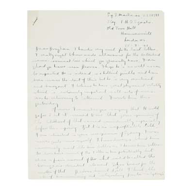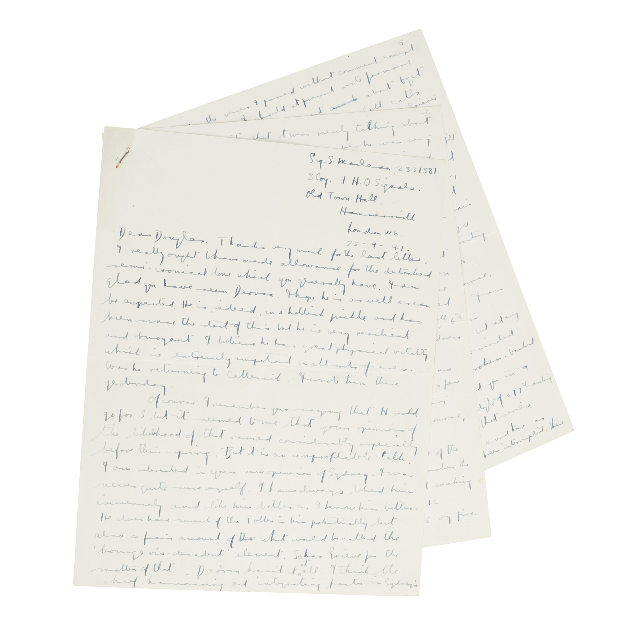 6 manuscript pp. on 3 leaves, each 17.5 x 23cm, dated 25-9-41, signed 'Somhairle', addressed to Douglas [Young], discussing mutual acquaintances including Sydney Goodsir Smith and Hugh MacDiarmid ("...I am interested in your new opinion of Sydney. I was never quite sure myself. I have always liked him immensely and like him better as I know him better. He does have much of the Toller in him potentially but also a fair amount of what would be called the 'bourgeois-decedent' element. So has Grieve for the matter of that."), his own life, as he cites family concerns preventing him from participating in the Spanish Civil War, and giving feedback to Young on one of his translations from Gaelic to English; MacLean also expresses his worries relating to the war