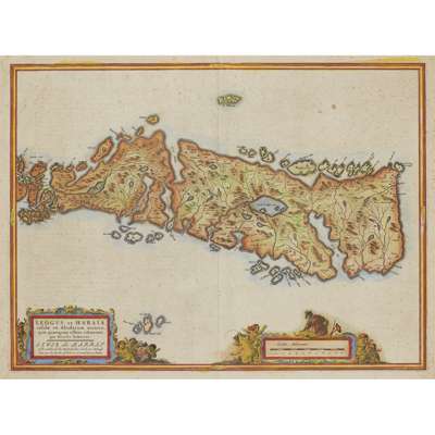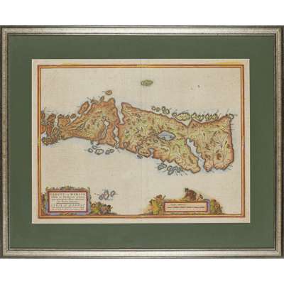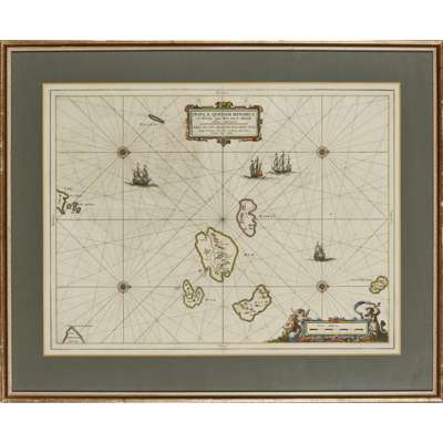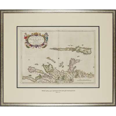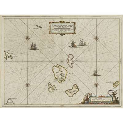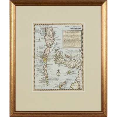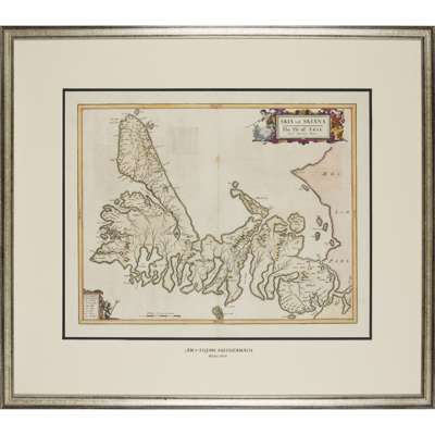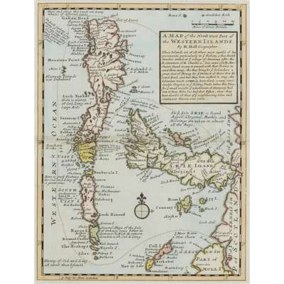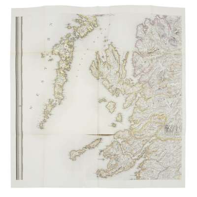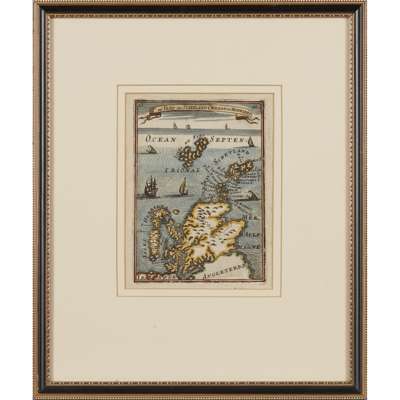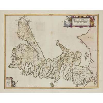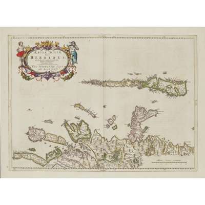 The Westerne Iles of Scotland. [Amsterdam, c. 1654], engraved map hand-coloured in outline, 425 x 575mm, framed and glazed; Blaeu, Joan. Lewis and Harray. [Amsterdam, c. 1650]. hand-coloured engraved map, 415 x 555mm., slightly spotted, framed and glazed; Blaeu, Joan. The Yle of Skie. [Amsterdam, c. 1654], engraved map, faintly hand-coloured in outline, 455 x 570mm, framed and glazed; Blaeu, Joan. Some of the Smaller Westerne Yles lying betweene the Iyles of Mull and Skye. [Amsterdam, c. 1654], engraved map, hand-coloured in outline, 410 x 540mm, French text on verso, small note in faint ink just below the island of Egg, framed and glazed; Moll, H. A Map of the North West Part of the Western Islands. [1725], later hand-colouring, slight darkening above centre fold, framed and glazed; Mallet, A.M. Is. de Fero de Scheland. Orknay et Hebrides. [c. Paris, 1683], hand-coloured engraved map, 155 x 117mm, framed and glazed; Lewis, Samuel. Topographical Dictionary... supplementary volume: Map of Scotland. 1849, 4to, map on 6 folding sheets, original cloth (6 maps and 1 volume)
