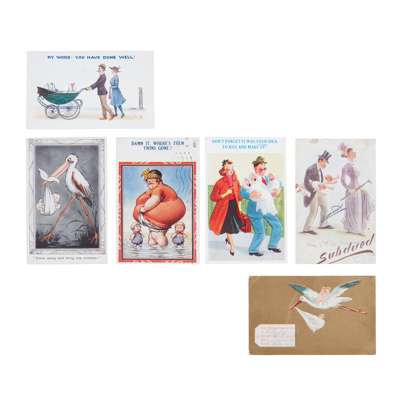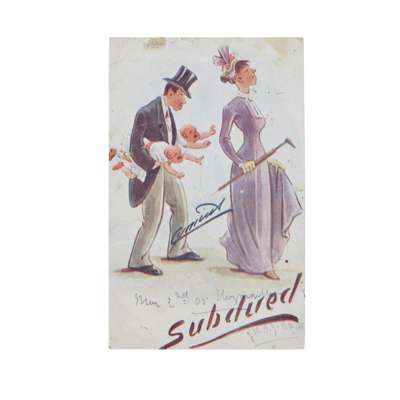 265 postcards in an album, mostly featuring baby twins and triplets, and many satirical, including: 'Subdued', an anti-suffrage postcard depicting a Suffragette marching ahead of her morose husband, who is carrying their twin children, dated 1905 and postmarked Weymouth; 'Two's Company - Till you get married', dated 1954; "Don't forget it was your idea to kiss and make up!", dated 1961; and a large number of others