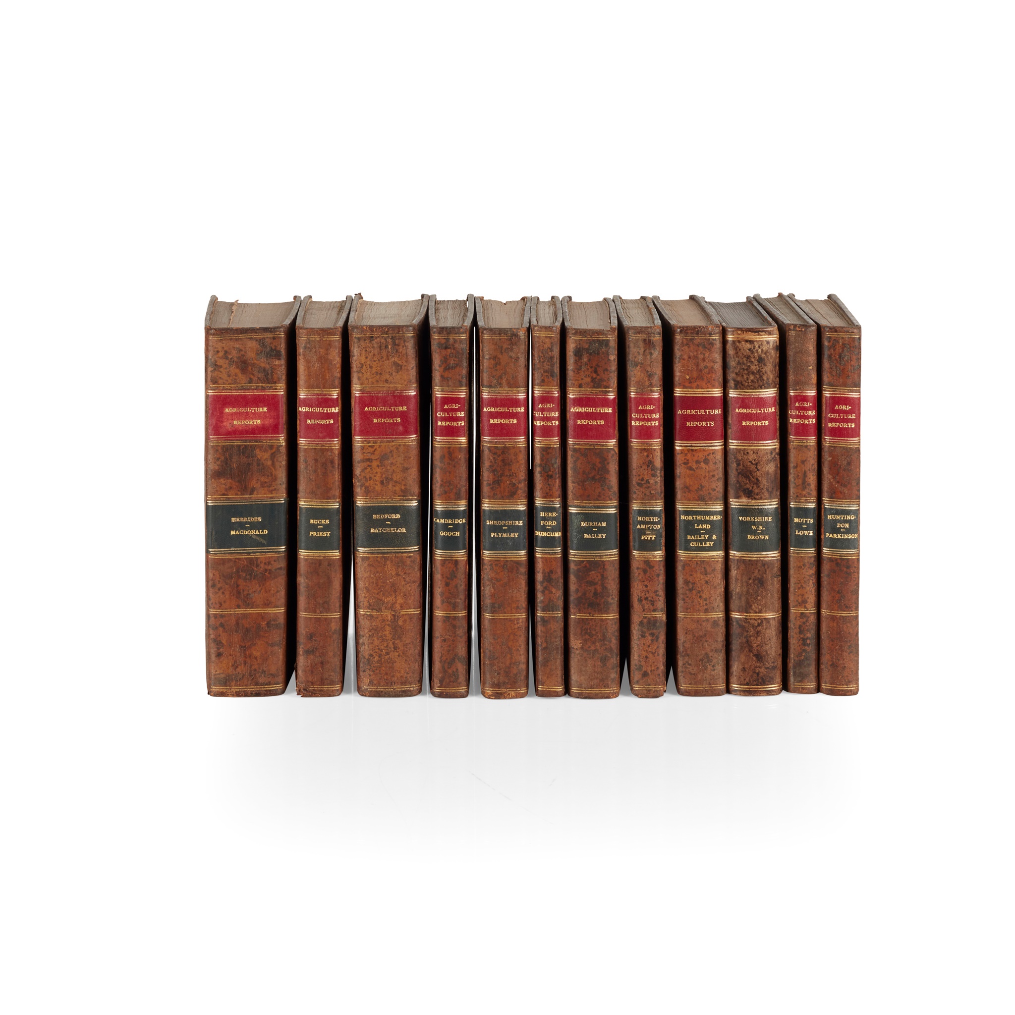 12 volumes, 8vo, contemporary calf, most with maps and many hand-coloured, comprising: General View of Agriculture of the West Riding of Yorkshire, 1799, without map; General View of Agriculture of the County of Durham, 1810; General View of Agriculture of the Hebrides, or Western Isles of Scotland, 1811, with frontispiece; General View of Agriculture of Buckinghamshire, 1813; General View of Agriculture of the County of Bedford, 1813; General View of Agriculture of the County of Cambridge, 1813; General View of Agriculture of the County of Northampton, 1813; General View of Agriculture of Northumberland, 1813, folding map torn with slight loss to engraved area; General View of the Agriculture of Shropshire, 1813; General View of Agriculture of the County of Nottingham, 1813; General View of Agriculture of the County of Hereford, 1813; General View of Agriculture of the County of Huntingdon, 1813 (12)