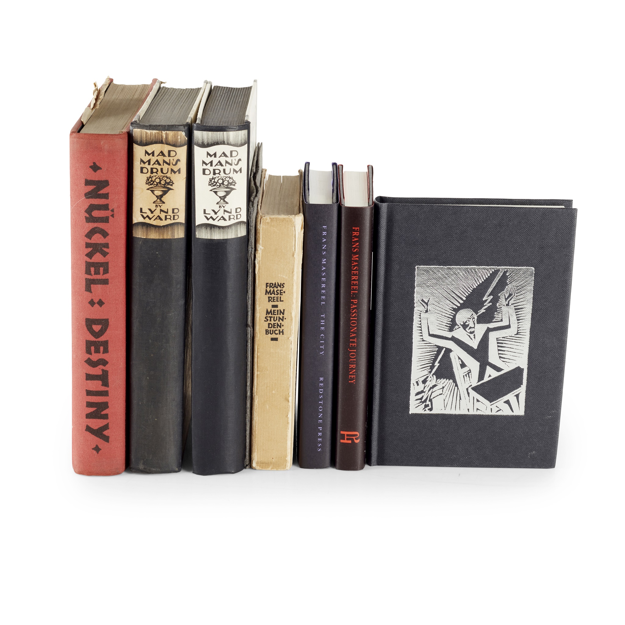 Nückel, Otto. Destiny. A novel in pictures. London: A.E. Marriott, 1930. 8vo, plates, original red pictorial cloth; Ward, Lynd. Madman's Drum. 1930. 2 copies, 8vo, woodcuts, original cloth-backed pictorial boards; Masereel, Frans. Mein Stundenbuch. Munich, 1926, 12mo, original boards, rubbed; and 3 modern Masereel facsimiles, in boxes; Masereel, Frans. Notre Temps. Belves, 1952, woodcuts, 1952, original wrappers (8)