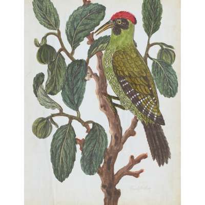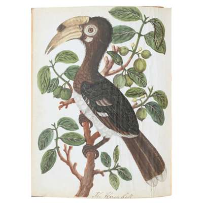 31 amateur laid-in watercolour illustrations of plants, birds, reptiles and fruit, including parrots, pigeons, bulbuls, a horn bill, plantains and a mango, each c.25 x 18cm; with 4 small rice paper paintings of Chinese people and 22 faded albumen prints taken in Southern Asia; several illustrations cropped, some dust-soiling