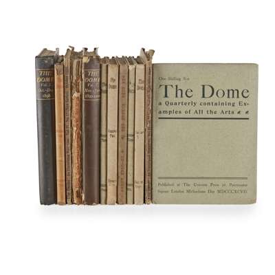 The Dome. London, 1897, no. 1 (1 copy), 2 (2 copies), 3 (3 copies), 4 (1 copy), these original greyish or brown boards, last with dustwrapper (frayed); volume 4 numbers 11 & 12 only, wrappers, rubbed; volume VII (New Series) containing numbers 19-21 in one, original wrappers, worn; The Dome vol. 1 Oct-Dec. 1898 and vol. 5 (Nov. 1899-1900), 2 volumes, original cloth, one worn (12)
