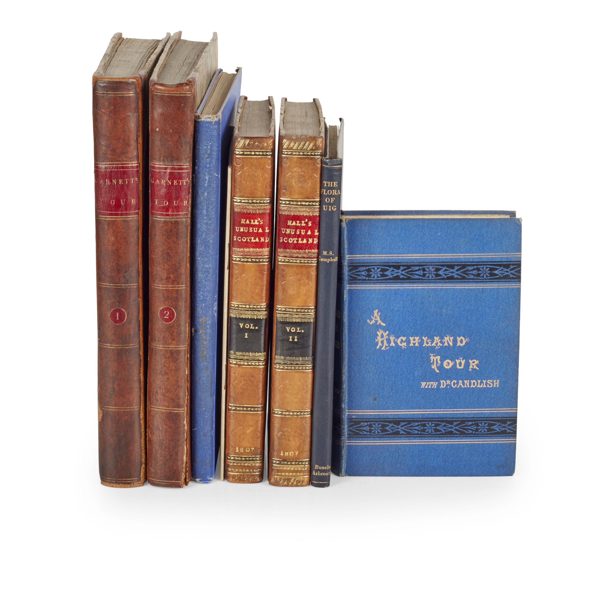 London: T. Cadell, Junior, & W. Davies, 1800. 2 volumes, 4to, folding map, 52 plates, contemporary half calf neatly rebacked retaining contemporary spines, a little browning, a couple of small closed tears to plates; Hall, Rev. James Travels in Scotland by an Unusual Route. London: J. Johnson, 1807. 2 volumes, 8vo, frontispiece, map, 28 plates, contemporary half calf neatly rebacked; Beith, Alex A Highland Tour. Edinburgh: Adam and Charles Black, 1874. 8vo, original blue cloth gilt; Campbell, M.S. The Flora of Uig (Lewis). Arbroath: T. Buncle & Co. Ltd., 1945. 8vo, blue cloth; Knight, G.A. Frank A Visit to the Outer Hebrides in Search of Mollusca, 1902. 8vo, original wrappers; MacRury, Ewen A Hebridean Parish. Inverness: Northern Chronicle Office, 1950. 8vo, blue cloth gilt (7)