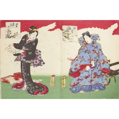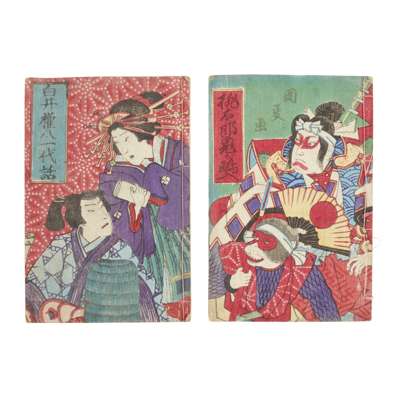 20 books, including one blank notebook, late 19th and early 20th century, containing a range of prints of nature scenes, woodblock prints of life and nature, instructions for games involving shapes and depictions of myths and legends, all bound in wrappers (20)