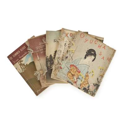 Murai, Gensai Hana, a Daughter of Japan. Tokyo: The Hochi Shimbun, 1904. 8vo, folding frontispiece, plates, original printed silk in folding case; English Instruction for Children [n.p., n.d.] 8vo, comprising 24 coloured woodcut illustrated leaves with pictures, English words and their translations into Kanji alongside their English pronunciations written in Katakana; Noguchi, Yone The American Diary of a Japanese Girl. London: Elkin Mathews, 1912. 8vo, original wrappers, folding case; [Idem] Lafcadio Hearn in Japan. London: Elkin Matthews, 1910. 8vo, cloth wrappers, folding case; [Idem] The Summer Cloud. Tokyo: The Shunyodo, 1906. 8vo, original wrappers; [Idem] Utamaro. London: Elkin Mathews, 1925. 8vo, original wrappers, folding case; [Idem] Hokusai. London: Elkin Mathews, 1925. 8vo, original wrappers, folding case; Florenz, Karl Poetical Greetings from the Far East: Japanese Poems. Tokyo: T. Hasegawa, [1896.] 8vo, original wrappers and folding case; Kyoto Commercial Museum The Official Catalogue. Kyoto, 1910. 8vo, original orange silk covered boards, worn; Adam, Jules Japanese Story-Tellers. Tokyo: T. Hasegawa, [c.1910] 8vo, original wrappers; 'G.J.' Little Songs of Shade and Sunshine. Tokyo: T. Hasegawa, [n.d.] 8vo, original wrappers; Bostwick, F.M. Oyucha San. Tokyo: T. Hasegawa, [1892?] 8vo, original wrappers; [Idem] Kohana San. Kyoto: T. Hasegawa, 1892. 8vo, original wrappers; Pang Tao (Flat Peaches) Eight Fairies Festival. [N.p., n.d.] Concertina book with hand-coloured plates, wooden boards; The Fifth National Industrial Exhibition of Osaka The Kwaigwa-Kessaku-Shu (The Collection of the Famouse Pictures). Kyoto: Yamada, Unsodo, 1903. 3 volumes, 8vo, original wrappers (17)