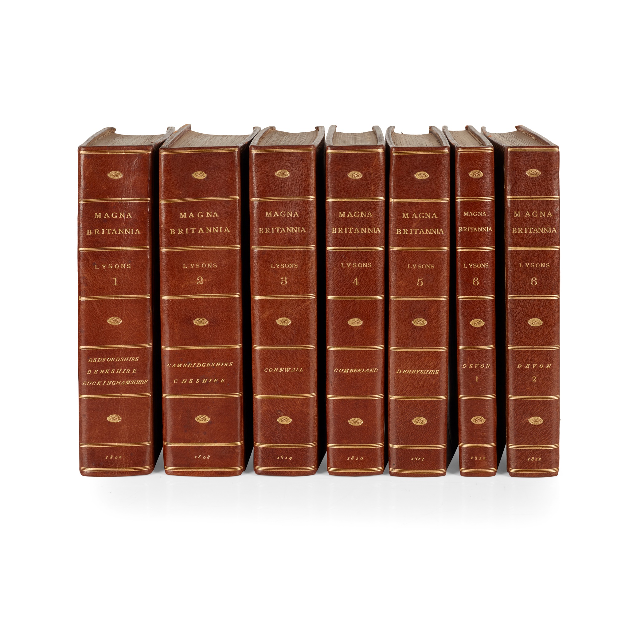 Being a concise topographical account of the several counties of Great Britain. London: T. Cadell, 1806. 4to, 6 books in 7 volumes, covering 9 counties, extra-illustrated with 192 plates from Britannia Depicta, contemporary calf gilt very neatly rebacked with later calf gilt spines, a.e.g., some internal foxing and offsetting, a little light dampstaining in places (7)