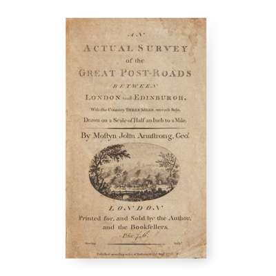of the Mineral Wells at Moffet in Annandale of Scotland... As also, The Oyly-Well.. at St Catharines Chappel in the Paroch of Libberton. Edinburgh: Robert Brown, 1664. First edition, 8vo, 3 parts in one volume, title within typographic border, 19th century brown morocco gilt, g.e., some leaves very slightly trimmed by the binder affecting some words, [ESTC N16384], lacks the general map, title lightly soiled; Armstrong, Mostyn John. An Actual Survey of the Great Post-Roads between London and Edinburgh. London: for the author, 1776. 8vo, engraved title and 44 maps, contemporary tree calf, neatly rebacked, spine gilt, lacks the general map, corners neatly repaired (2)