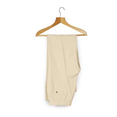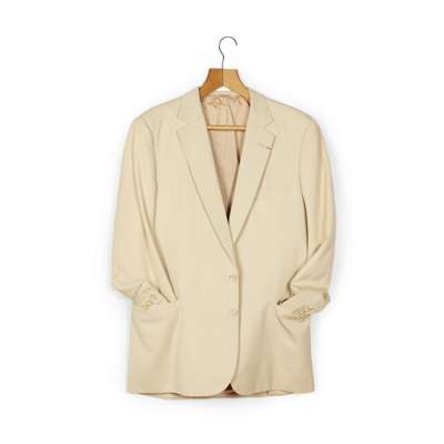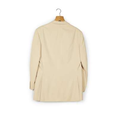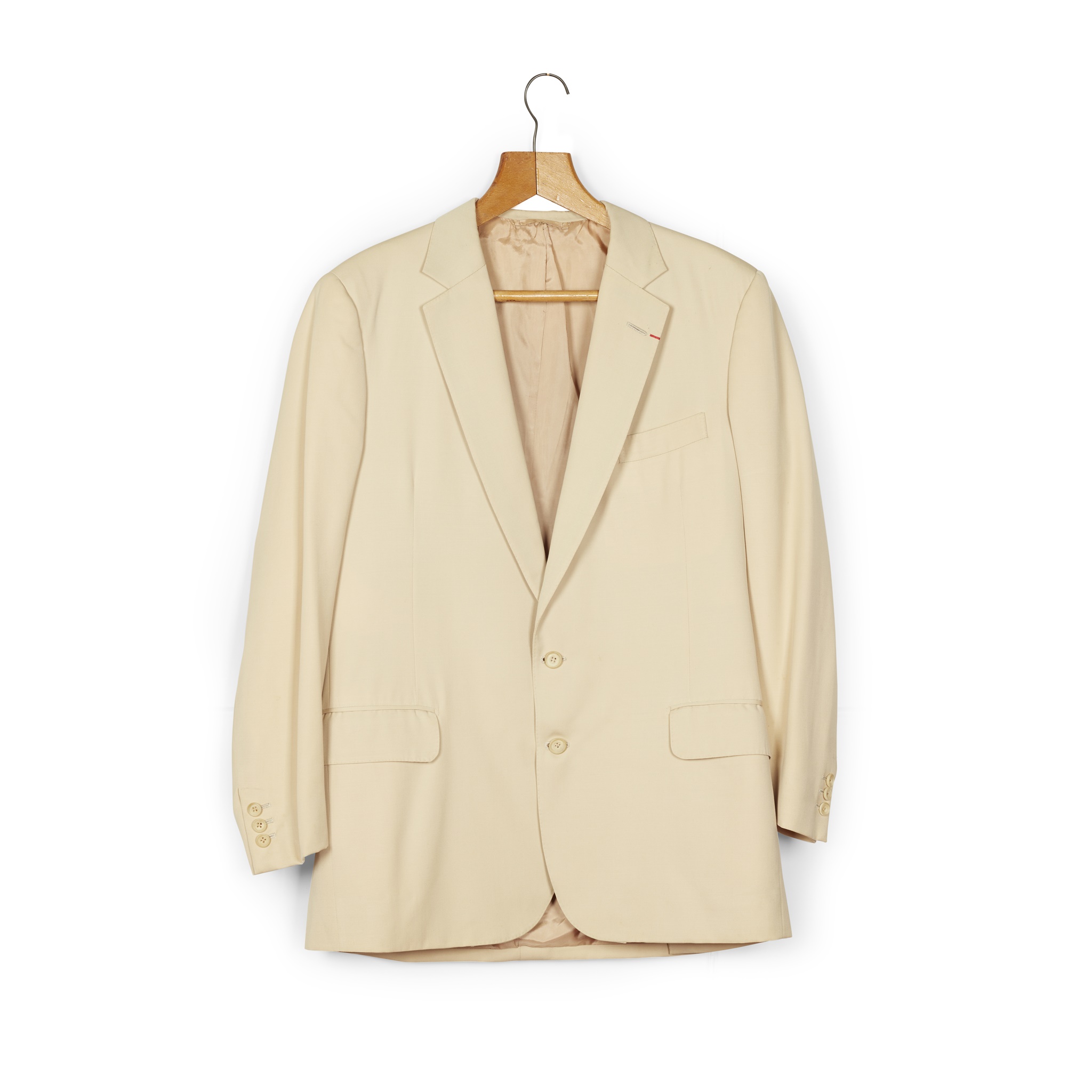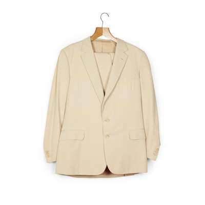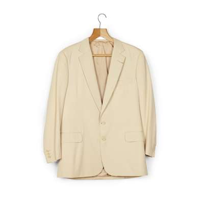 cream two-button suit jacket and trousers worn by Sean Connery possibly whilst filming Five Days One Summer, “Sean Connery 21.7.82 16140" printed on Hayward label to inside trouser pocket; and an additional cream two-button jacket with a small red ribbon to the lapel (3)