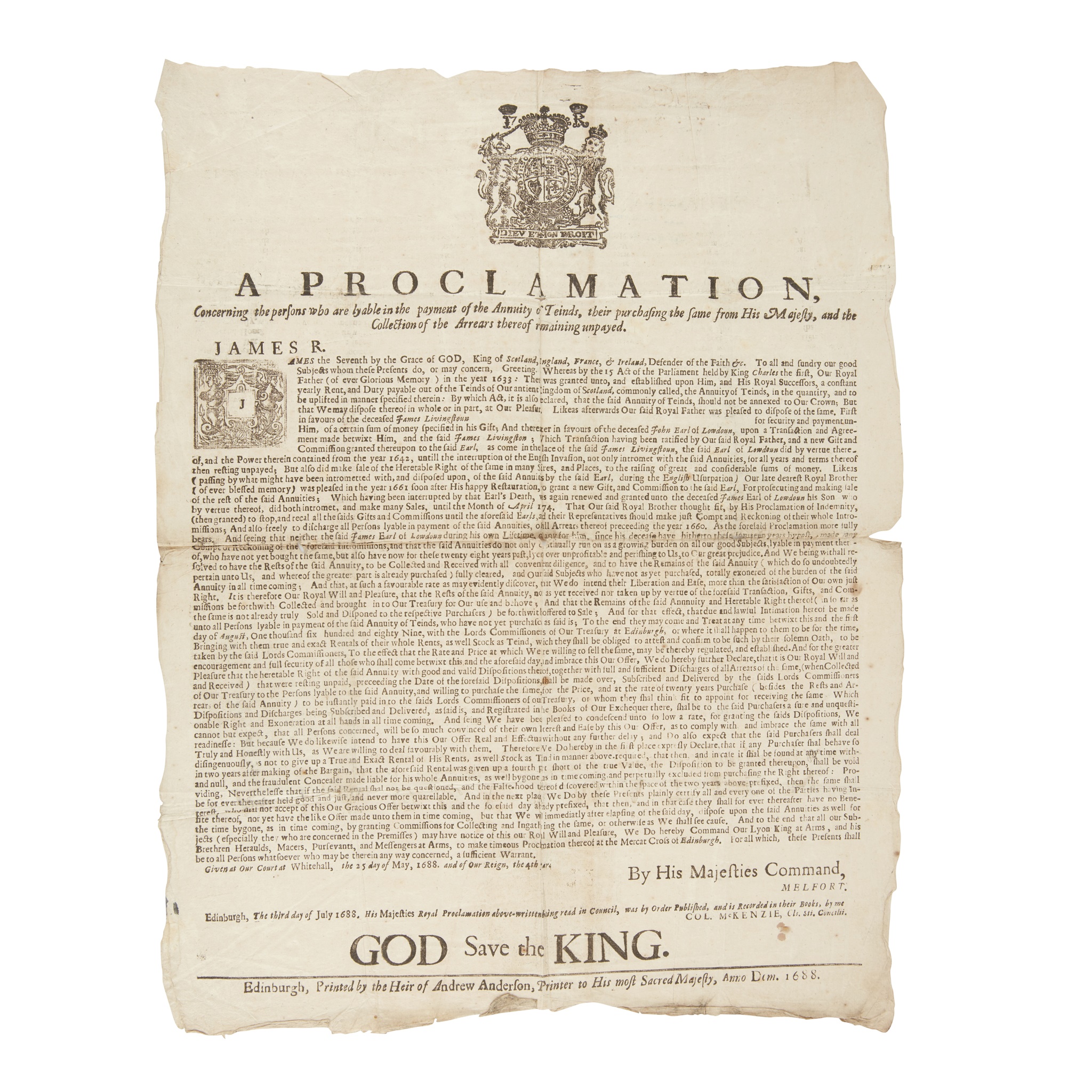 Edinburgh: printed by the Heir of Andrew Anderson, 1688. Broadside, 35 x 45cm, early manuscript title and later provenance note to reverse, small hole to centre, some creasing [ESTC R18905 listing 8 copies]