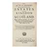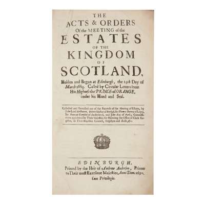 The acts and orders of the meeting of the Estates of the Kingdom of Scotland holden and begun at Edinburgh, the 14th day of March 1689. Edinburgh, 1690; Laws and Acts made in the Second Session... holden at Edinburgh the 25th day of April 1690. Edinburgh, 1690; Laws & Acts made in the Third Session... holden at Edinburgh, the third day of September 1690; The Laws and Acts made in the Fourth Session... holden at Edinburgh April 18, 1693. Edinburgh, 1693; The Laws and Acts made in the Fifth Session... holden and begun at Edinburgh May 9 1695, Edinburgh, 1695; The Laws and Acts made in the Sixth Session... holden at Edinburgh Sept. 8, 1696. Edinburgh, 1696; The Laws and Acts made in the Seventh Session... holden at Edinburgh July 19 1698. Edinburgh, 1698; Articles of Regulation concerning the Session. Edinburgh, 1695; Additional Articles of Regulation concerning the Session. Edinburgh, 1696, contemporary panelled calf, early inscription of William Wood, 1711, sold not subject to return