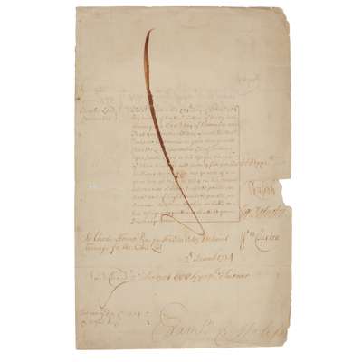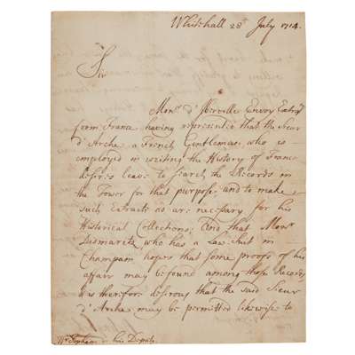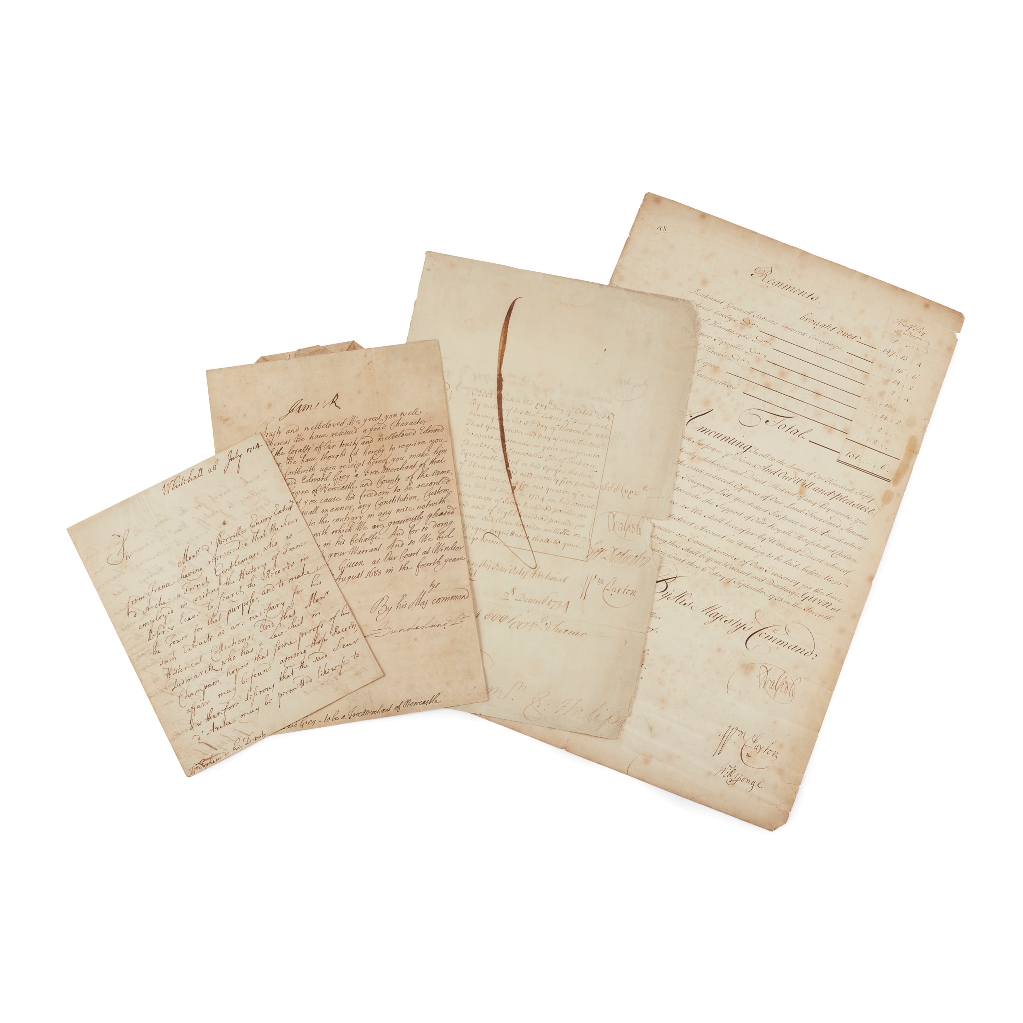 dated Windsor, 28th August 1688, appointing Edward Greg of Newcastle (upon Tyne) to the position of Free Merchant, signed ‘James R’, countersigned by Lord Sunderland, addressed to Timothy Davison, Governor of the Company of Merchants, Newcastle upon Tyne, 19 x 30.5cm, some browning, a few neat repairs; Bolingbroke, Henry St John, Viscount, 1678-1751 Letter Signed, dated Whitehall, 28th July 1714, on paper, writing to ‘Mr Topham or his Deputy’ asking that Monsieur Corville, Envoy Extraordinary from France, be admitted to The Tower to review records kept there, on behalf of the Signeur d’Arche (the author of a history of France) and on behalf of M. Desmarck, who is searching for documents to support a lawsuit, 2pp., 17.5 x 22.5cm; Walpole, Robert, 1676-1745 Order for Payment, signed [and the Royal Hospital at Chelsea] dated October 6th 1734, order to pay Charles Lord Cornwallis £375 without account for one quarter of a year “on his several allowances of Seven hundred pounds per ann and of Eight hundred pounds per annum and these together with His ? assigns acquittances shall be your Discharge herein”, signed Walpole, Halifax and others, 23.5 x 37cm, a little chipping and worming; [Idem] Sum of accounts, dated 6th September 1733, "Accounting in all to the Sume of One Hundred Fifty One Pounds, and Sixpence... And Our Will and Pleasure is, And we do hereby Authorize and Direct, That out of any Payments, you shall make to the said reduced Officers of Our Land Forces and Marines... you deduct Six Pence in the Pound which is to be Applied towards the Support of Our Royall Hospitall at Chelsea...", signed Walpole, Clayton and Yonge, on paper, 29 x 46 cm (4)