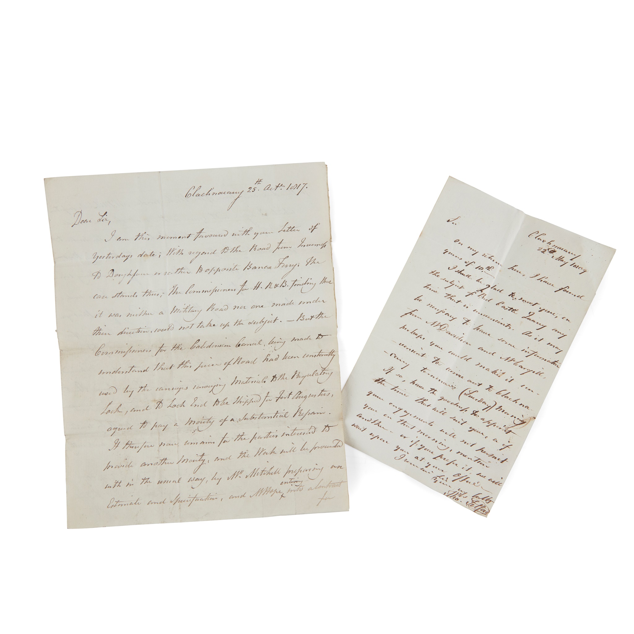 ALS dated Clachnacany 22nd May 1809, to James Grant Esq. of Inverness, regarding Mr Grant's Quarry at Red Castle, 12.5 x 20cm; ALS dated Clachnacany 25th October 1817, to James Grant Esq. of Inverness, regarding the Commission for H. B. & B. Findry[?] and monetary dealings with the Commissioners for the Caledonian Canal, and mentioning the condition of surrounding roads, and renumeration for the clay taken from Mr Grant's quarry, 3pp., 19.5 x 24cm (2)