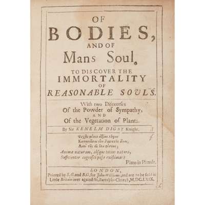 To discover the Immortality of Reasonable Souls. With two discourses of the Powder of Sympathy and of the Vegetation of Plants. London: John Williams, 1669. 8vo, contemporary calf, lacking the initial leaves (A3) and (A4), a little light browning and slight dampstaining, ownership signature dated 1888 to front free-endpaper [ESTC R20320]; [Papier Maché Binding] The Holy Bible... London: G.E. Eyre and Spottiswoode, 1848 [bound with the New Testament]. 16mo, contemporary papier maché binding, lacking clasp, a few chips (2)