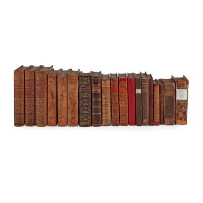 Hooker, Richard The Works.. with an account of his life and death by Isaac Walton. Oxford, 1845. 3 volumes, 8vo, contemporary calf gilt, arms gilt on sides, g.e., slightly rubbed; another edition of the same. Oxford, 1793, 3 volumes, 8vo, contemporary half calf, rubbed; Montaigne, Michel de Montaigne's Essays... translated by Charles Cotton... sixth edition. London, 1743, 3 volumes, 8vo, early 19th century red panelled morocco, rebacked, two volumes with original spine laid down; Montaigne, M. de Essays. 1870, 8vo, calf, rebacked; Ashmole, E. The History of the most Noble Order of the Garter. 1715, 8vo, engraved plates, contemporary half calf; Sparke, Edward Primitive Devotion in the Feasts and Fasts of the Church of England... eighth edition. London, 1700. 8vo, frontispiece, contemporary calf, rebacked, slight worming affecting a few words; Montaigne, Michel de Essays... made English by Charles Cotton. London: M. Gilliflower [&c.], 1700, Volume 1-2 (of 3), engraved frontispiece in volume 2 only, old calf and old vellum, both worn, hinges weak; Hawkins, W. A Short Account of the Life of the Right Reverend... Thomas Ken. London: J. Wyat, 1713. 2 copies, 8vo, frontispiece portrait, contemporary calf, both rebacked, one slightly soiled; and 3 others; sold not subject to return (19)