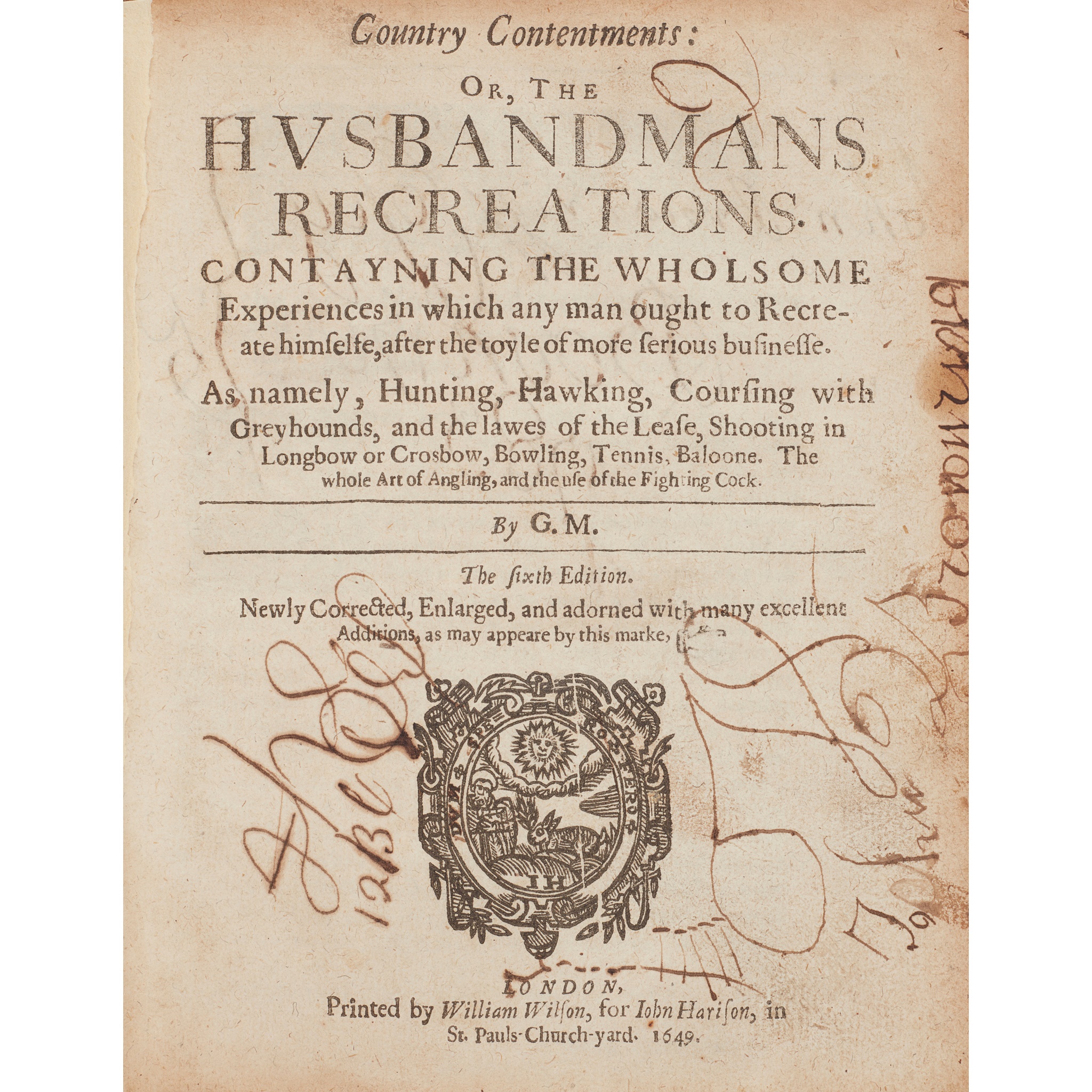 Containing The Wholesome Experience, in which any ought to Recreate himself, after the toil of more serious Business. London: printed by Nicholas Okes, for John Harison, 1631. Fourth edition, 8vo, modern calf with raised bands, pencil inscription to title page, dust-soiling throughout; [Idem] Country Contentments. London: printed by William Wilson, for John Harison, in St Paul's Church-yard, 1649. Sixth edition, 8vo, modern tan calf with raised bands ink inscriptions to verso and p.118, dust-soiling; [Idem] Country Contentments. London: for George Sawbridge, at the Sign of the Bible Ludgate-Hill, 1683. Eleventh edition, 8vo, quarter calf with brown cloth boards, some foxing and dust-soiling, ink inscription dated 1781 to verso of title page (3)
