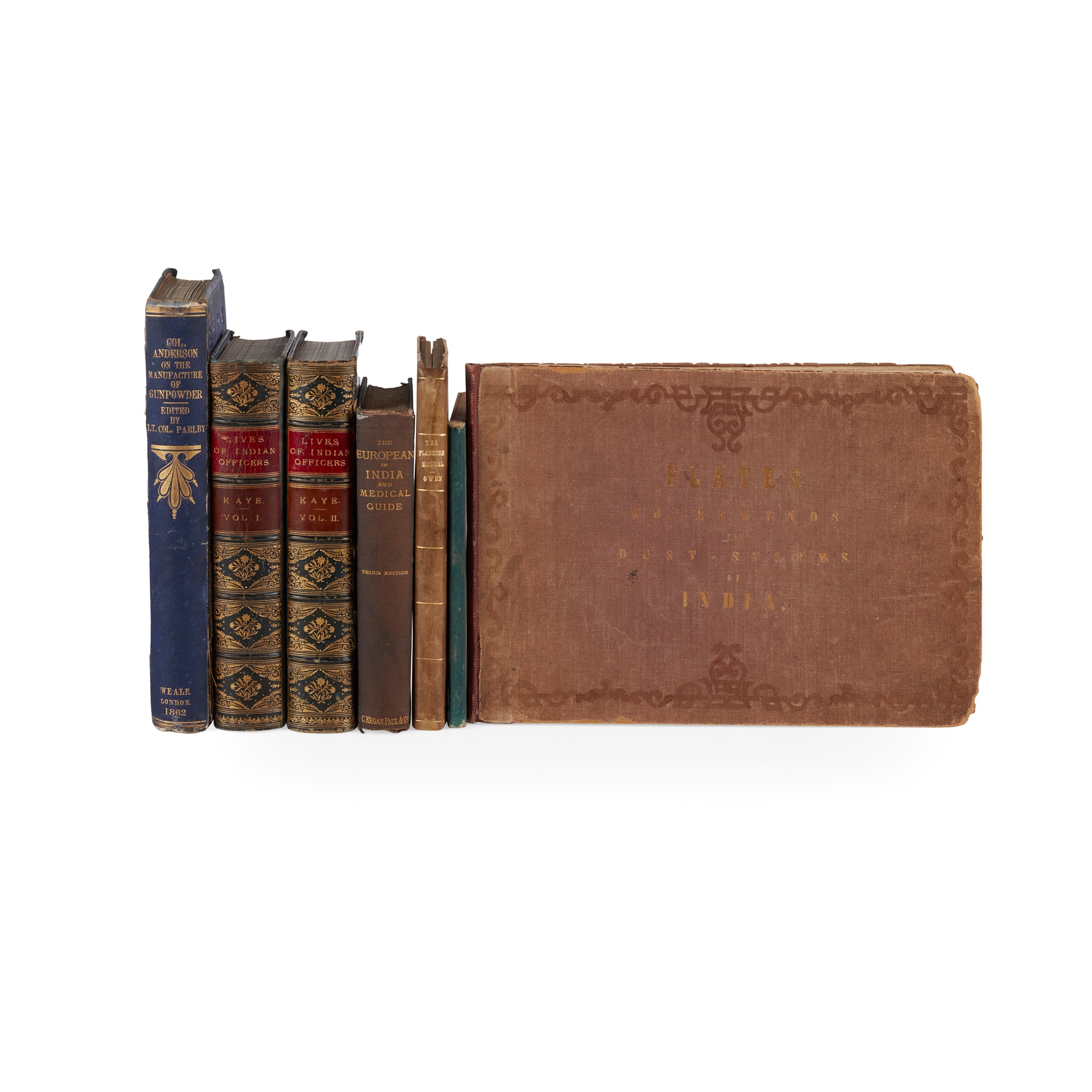 Baddeley, P.F.H. Plates. Whirlwinds and Dust Storms of India. An Investigation into the Law of Wind and Revolving Storms at Sea. London: Bell and Daldy, 1860. First edition, oblong 4to, 19 black and white lithographed plates of illustrations and diagrams. one folding, original brown cloth, gilt text and wind card diagrams; Hull, Edmund C. P. and Mair, R. S., M.D. The European in India; or, Anglo-Indian's Vade Mecum. with Medical Guide for Anglo-Indians. London: C. Kegan Paul & Co., 1878. Third edition, 12mo, original brown buckram; Kaye, John William Lives of Indian Officers, Illustrative of the Civil and Military Services of India. London: A. Strahan & Co., 1867. First edition, 8vo, 2 volumes, marbled endpapers, contemporary blue calf binding, decorative gilt spine with red and brown inserts; Anderson, Col. William and Parbly, Lieut. Col. Samuel Sketch of the Mode of Manufacturing Gunpowder at the Ishapore Mills in Bengal. London: John Weale, 1862. First edition, 8vo, 10 plates [5 fold out], original blue cloth with gilt canon illustration and decorative blindstamping; Owen, T.C. The Tea Planter's Manual. Colombo: A.M. & J. Ferguson, 1886. First edition, 8vo, 2 fold-out coloured plates illustrating tea factory, planters' advertisements, contemporary orange morocco binding, calf spine, pasted title; Hutchison, J. and L.R.C.P. & S.E. Chamba Guide to Dalhousie, Chamba and The Inner Mountains between Simla and Kashmir. Lahore: Civil and Military Gazette, 1923. 8vo, 3 fold-out maps, ink stamp on free endpaper, grey boards (7)