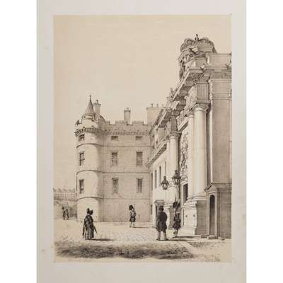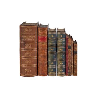 Arnot, Hugo The History of Edinburgh. Edinburgh, 1788. 4to, engraved folding plan and 19 plates, some folding, contemporary tree calf, red morocco label, joints partly split; Allen, J. Romilly The Early Christian Monuments of Scotland. 1903. Thick large 4to, illustrations, plates, original black half morocco gilt, t.e.g., slightly rubbed, slightly faded; Kay, John A Series of Original Portraits and Caricature Etchings. 1843, 2 volumes, 8vo, engraved plates, contemporary blue half morocco, spines gilt, t.e.g.; Bell, George Day and Night in the Wynds of Edinburgh. 1849. 8vo, original wrappers bound in, maroon half morocco, rubbed; Mary Stewart, Queen of Scots An Historical Drama. Edinburgh, 1801. 8vo, contemporary calf, spine gilt, head of spine lightly rubbed; [Gambier, Captain] The Proceedings on the Trial of Captain G-------- for Crim. Con. with Ad----- l K....'s Lady. 1757. Second edition, 8vo, contemporary half calf, worn, library stamp largely deleted from title; Gerrald, Joseph The Trial of Joseph Gerrald... for Sedition. Edinburgh, [c. 1794], 12mo, contemporary half calf, joints split; Swarbreck, S.D. Sketches in Scotland. London, 1839. Folio, lithographed title-page and 24 lithographed plates, original cloth gilt, spine lacking, worn, plates with some soiling (9)