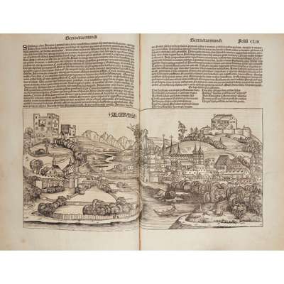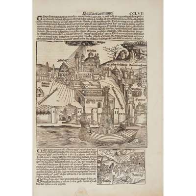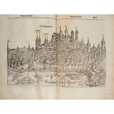 Note: One of the most important German incunables, The Nuremberg Chronicle (as this work is commonly known) is the most richly illustrated printed book produced in the fifteenth century. The text is a universal history of the Christian world from the beginning of times to the early 1490s, written in Latin by the Nuremberg physician and humanist Hartmann Schedel (1440-1514) on commission from the Nuremberg merchants, Sebald Schreyer (1446-1520) and Sebastian Kammermeister (1446-1503). Drawn by the author from multiple medieval and Renaissance sources, such as Bede, Vincent of Beauvais, Martin of Tropau, Bartolomeo Platina, Flavius Blondus, and Philippus de Bergamo, the Chronicle also provides detailed information on the history and topography of European countries and towns. The narrative is divided into 11 parts, the so-called "world ages", and is profusely illustrated with images of biblical and historical events, alongside topographical views of towns and countries in Europe and the Middle East, including Jerusalem (and its destruction) and Byzantium.